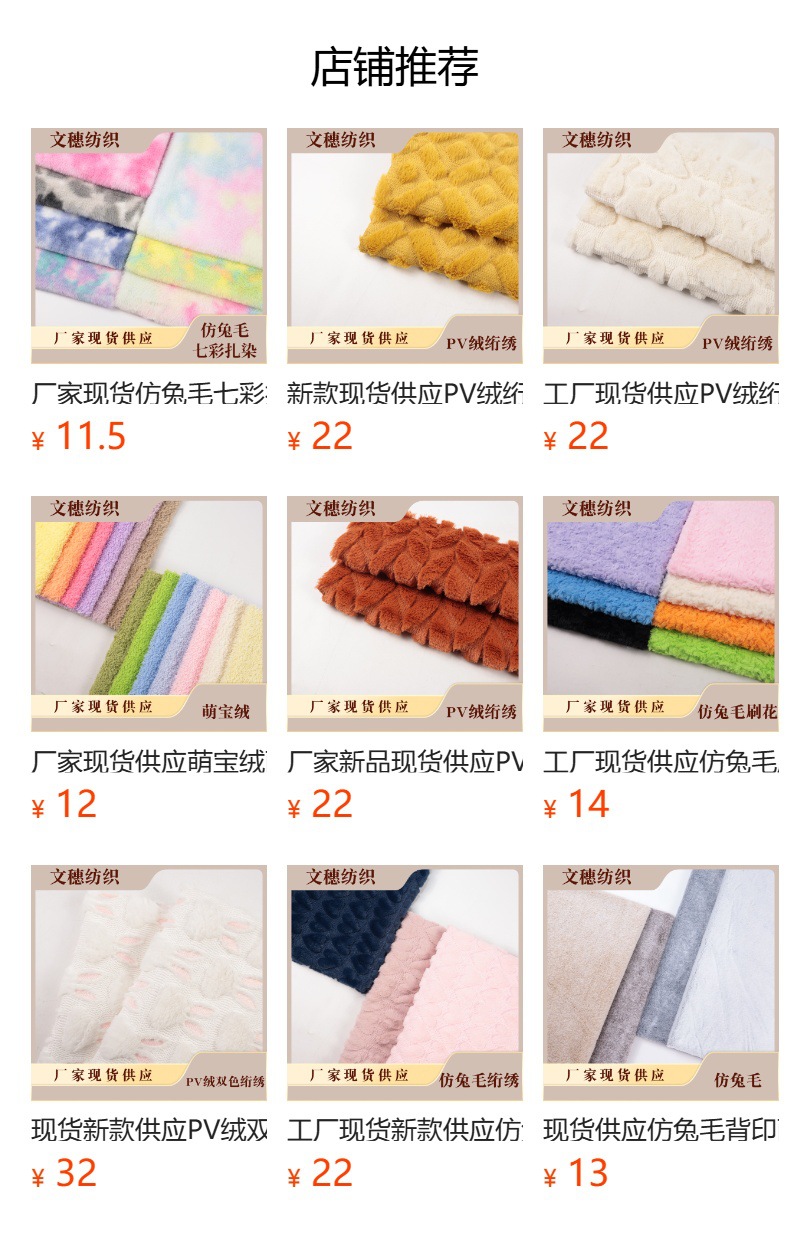 メーカーは、かわいいベビーベルベット生地、秋冬のバッグ、ペット用品、おもちゃ、衣類、ホームテキスタイル生地を在庫しています。