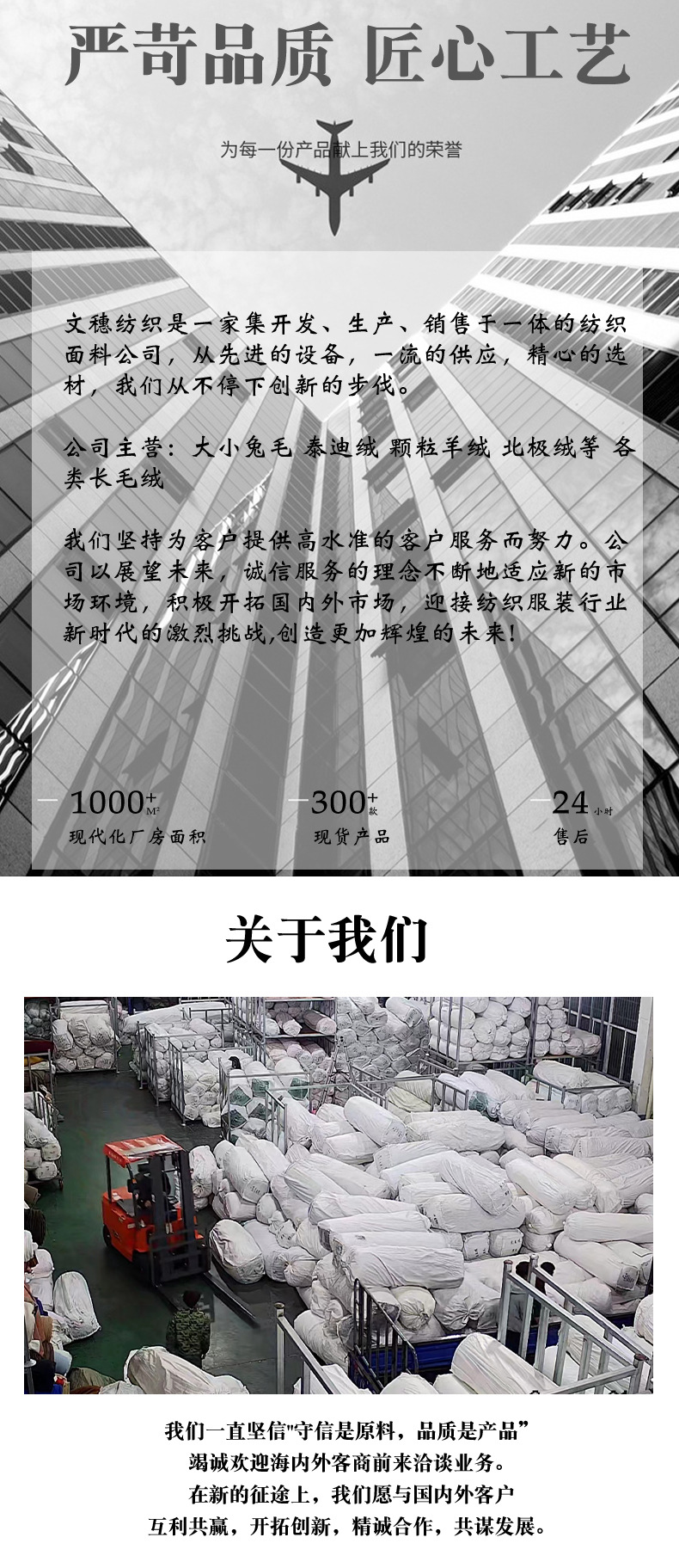工場は、秋冬の衣類、コート、帽子、おもちゃのぬいぐるみ生地用の模造ウサギの毛ブラシ生地を供給しています。