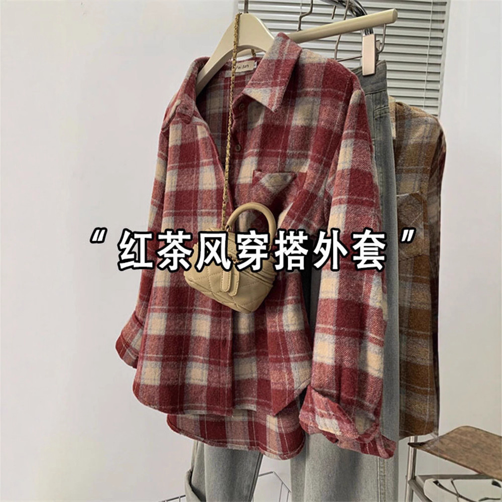 红色复古磨毛格子衬衫女2025秋冬季新款宽松加厚叠穿长袖衬衣外套