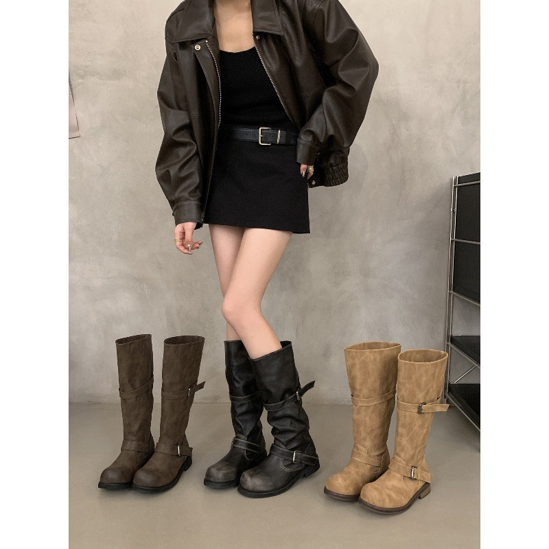 复古擦色做旧长筒机车靴女2025秋冬新款粗跟中筒靴工装不过膝长靴