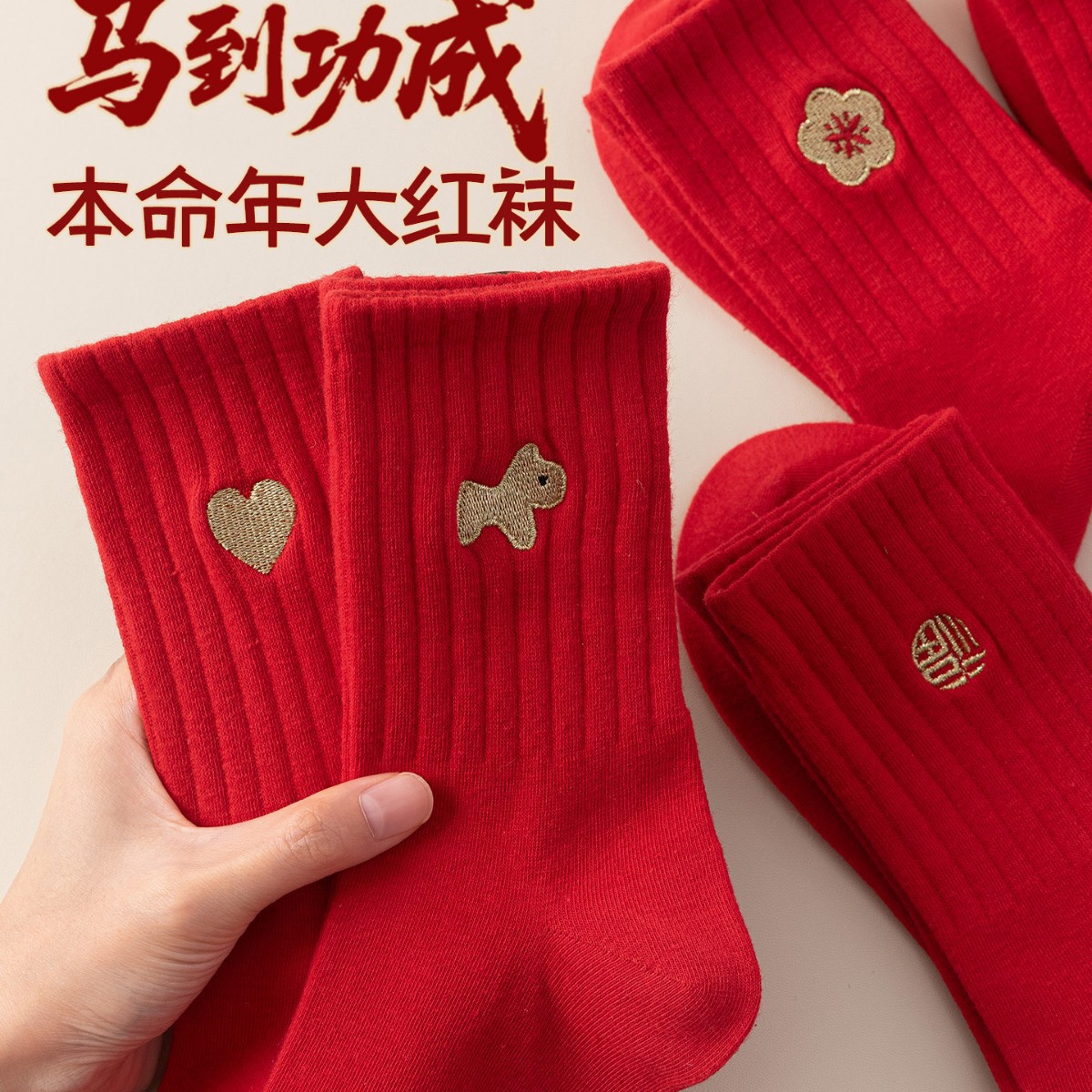 红色本命年袜子女中筒袜秋冬季属马女士结婚新年礼物长袜