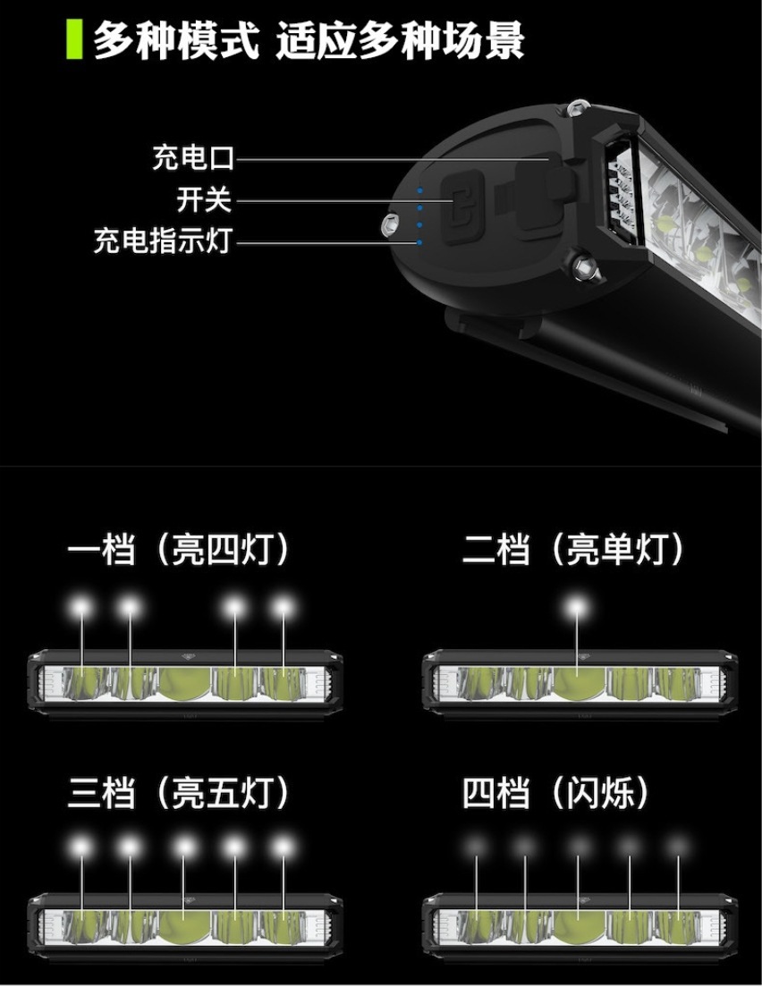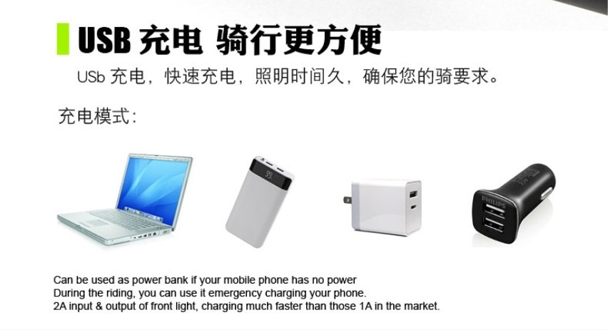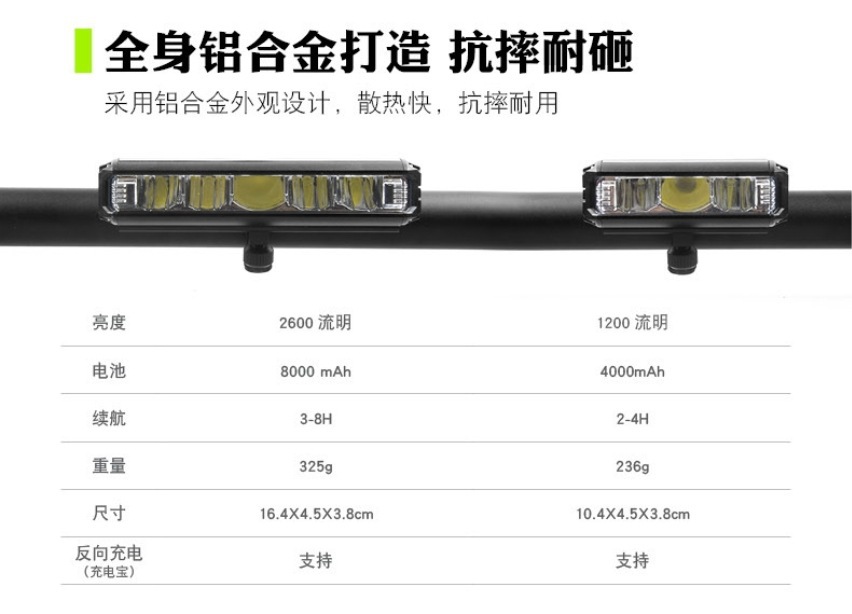 山地车自行车夜骑前照明灯充电宝铝合金横版USB自行车灯前灯
