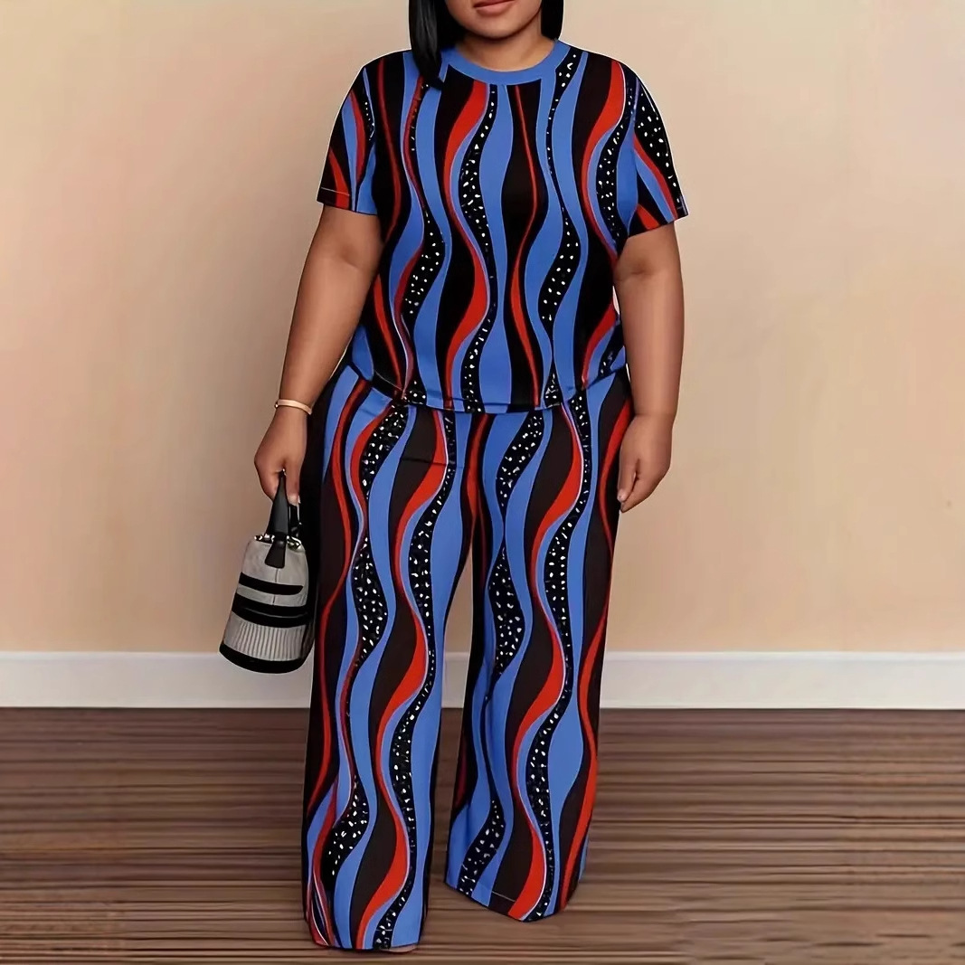 2025 春夏クロスボーダー特別供給外国貿易スポット大きいサイズの女性のダイナミックな波形ブルーとオレンジのコントラストカラースーツメーカー卸売