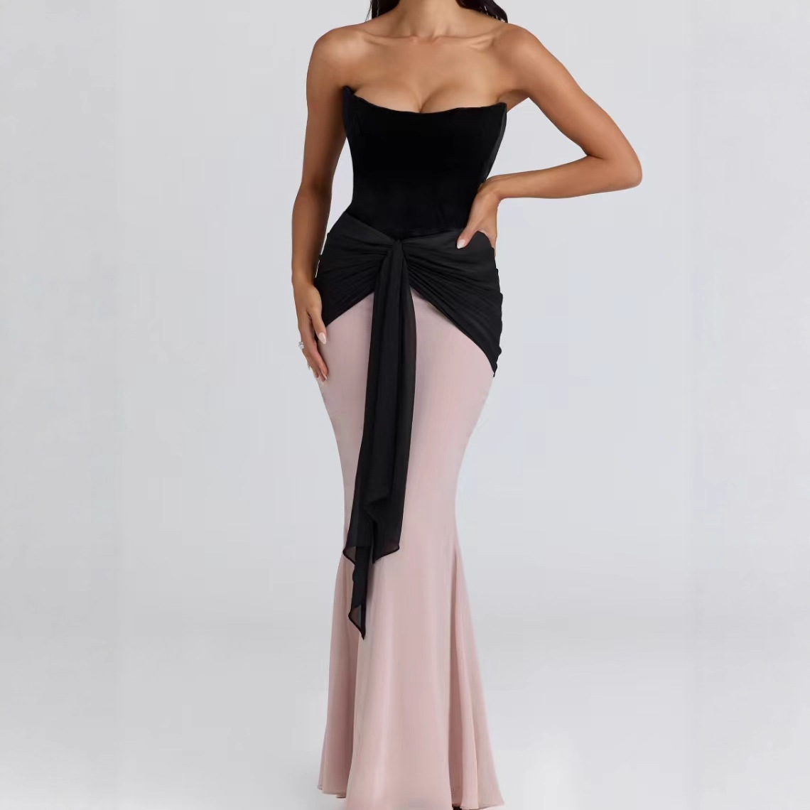 ヨーロッパとアメリカのクロスボーダーチューブトップドレス、高級イブニングドレス、春夏気質ジャカードノースリーブバックレスウエストレースアップロングスカート