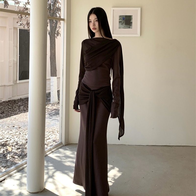 棕色波点多穿法系带长袖T恤上衣+金色压褶抽绳腰层叠感半身裙