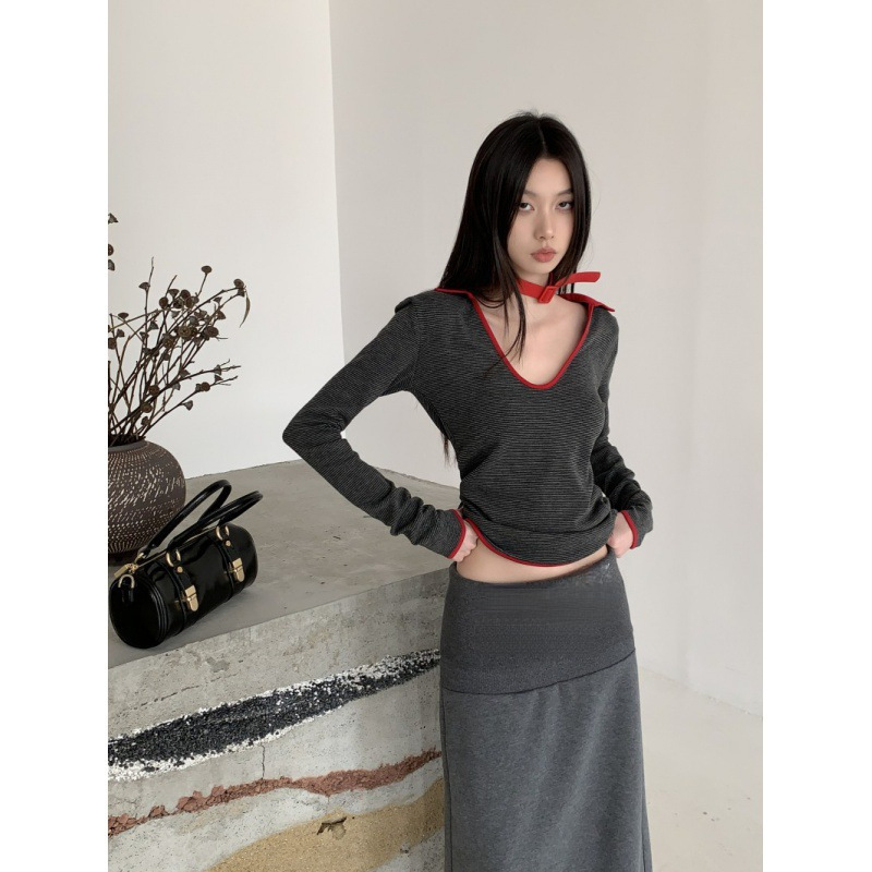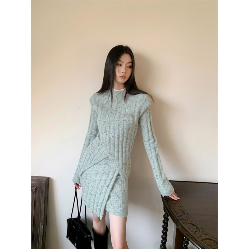 设计感气质优雅针织拼接套装飘带修身褶皱上衣绑带包臀长裙