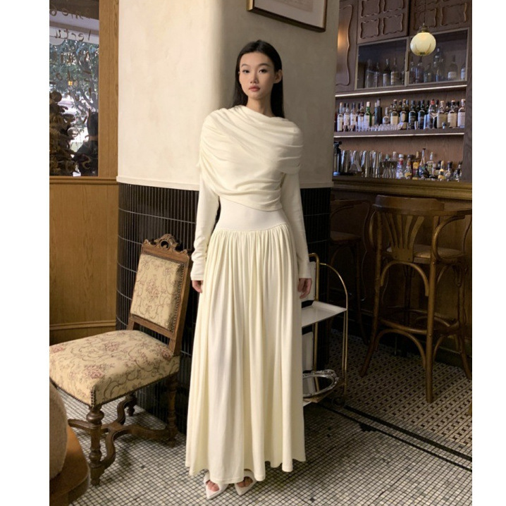秋の新しい白いしわ低腰長袖ニットワンピース