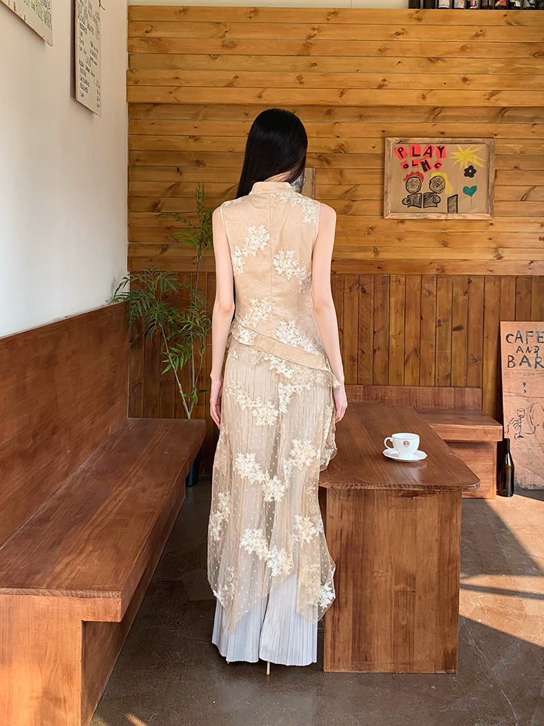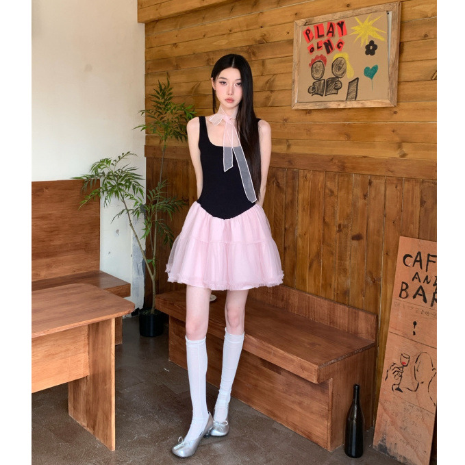 设计感女装新款闪闪网纱背心不规则下摆半身裙套装
