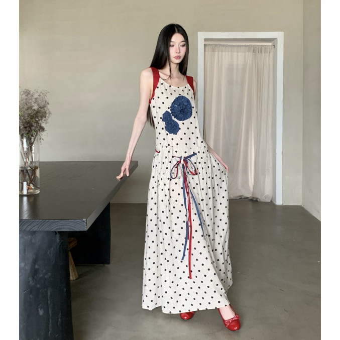 复古度假长裙子波点亚麻立体盘花长款连衣裙