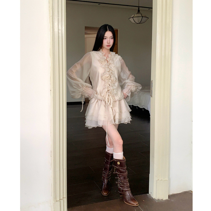 现货秋新款米色领花边灯笼袖衬衫+打底短裤法式复古两件套