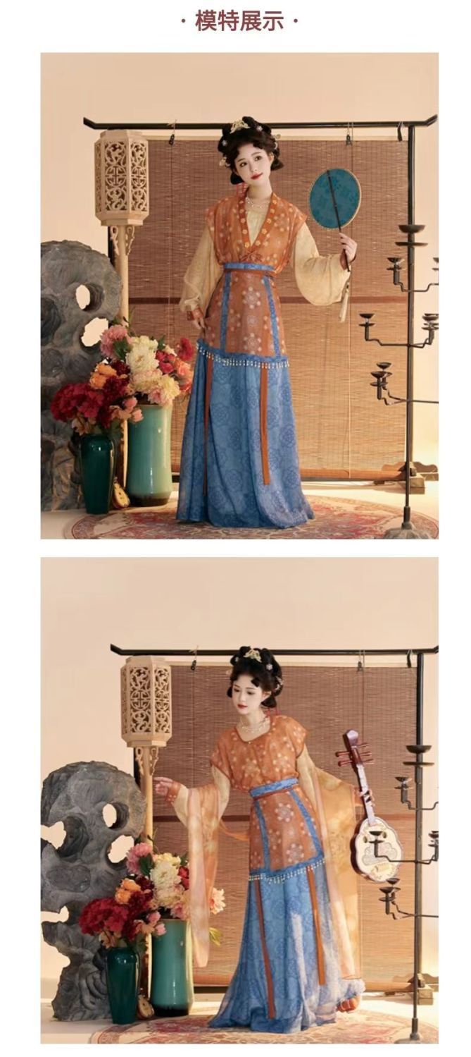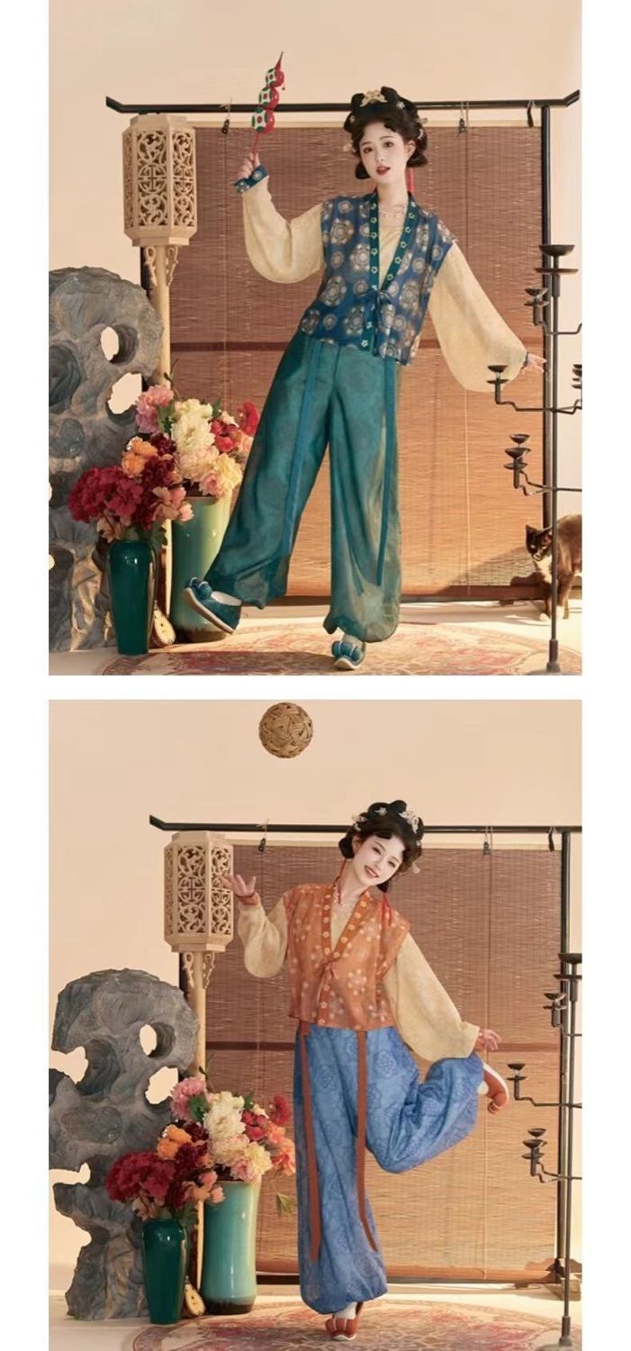 唐製の漢服の女性2025の新型の復元の金の唐の子の破れたスカートの灯籠のズボンの見知らぬ人の腹はやせている気質の3色のスーツを現します。