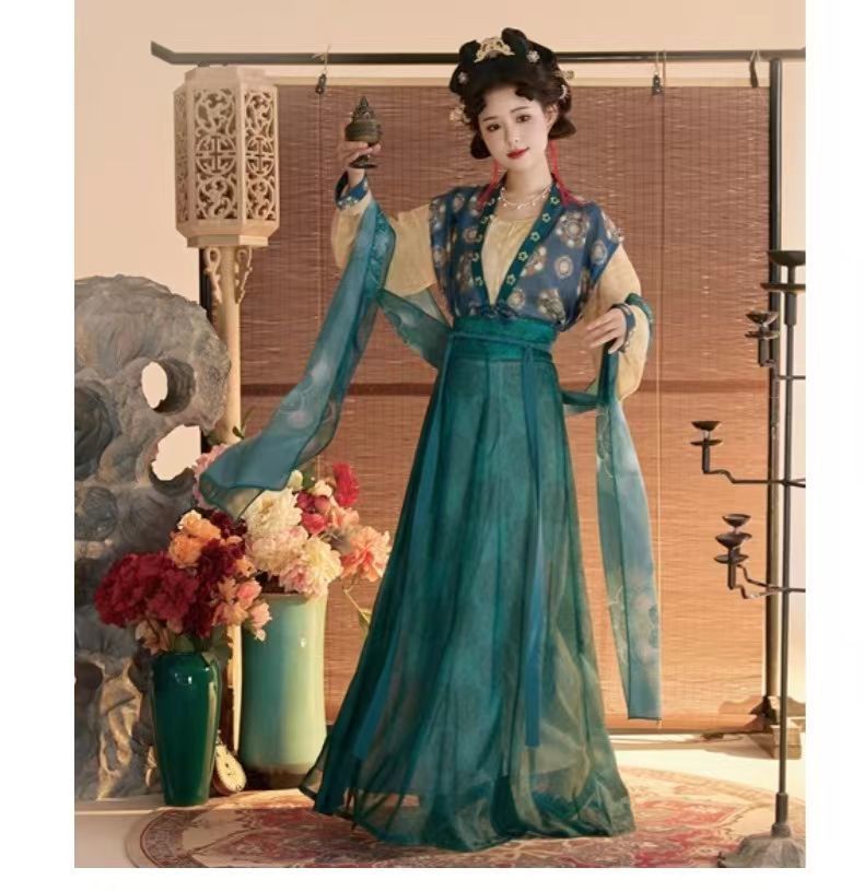 唐製の漢服の女性のホーテのスカートの古風な復元の金の唐製の漢服の金の逸の貴妃の薄い金の写真の古代の春夏