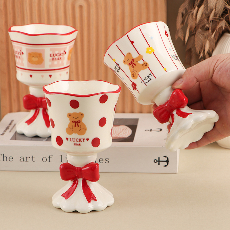 设计感小众红色蝴蝶结小熊雪糕杯高脚杯办公室高颜值咖啡杯奶茶杯