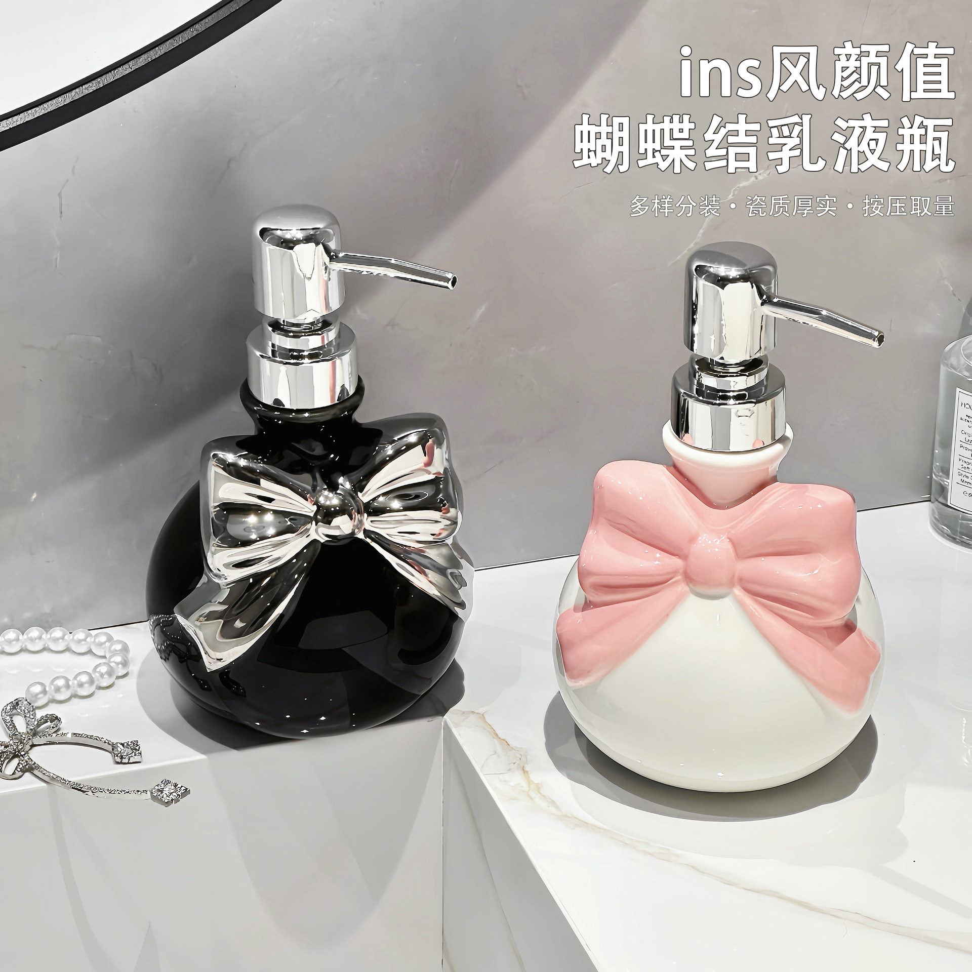 蝶結び手洗い液瓶陶磁器トイレ乳液瓶入浴剤シャンプープレス式分注瓶空瓶