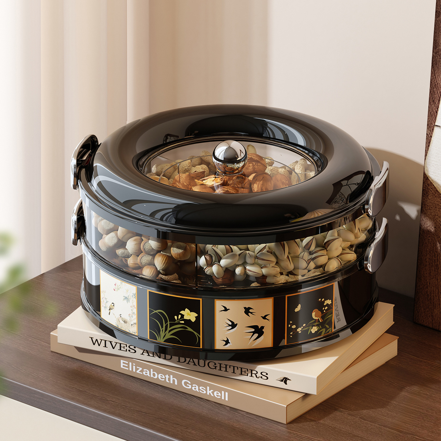 高颜值果盘家用中古风可旋转密封零食坚果收纳盒新款家用干果盘