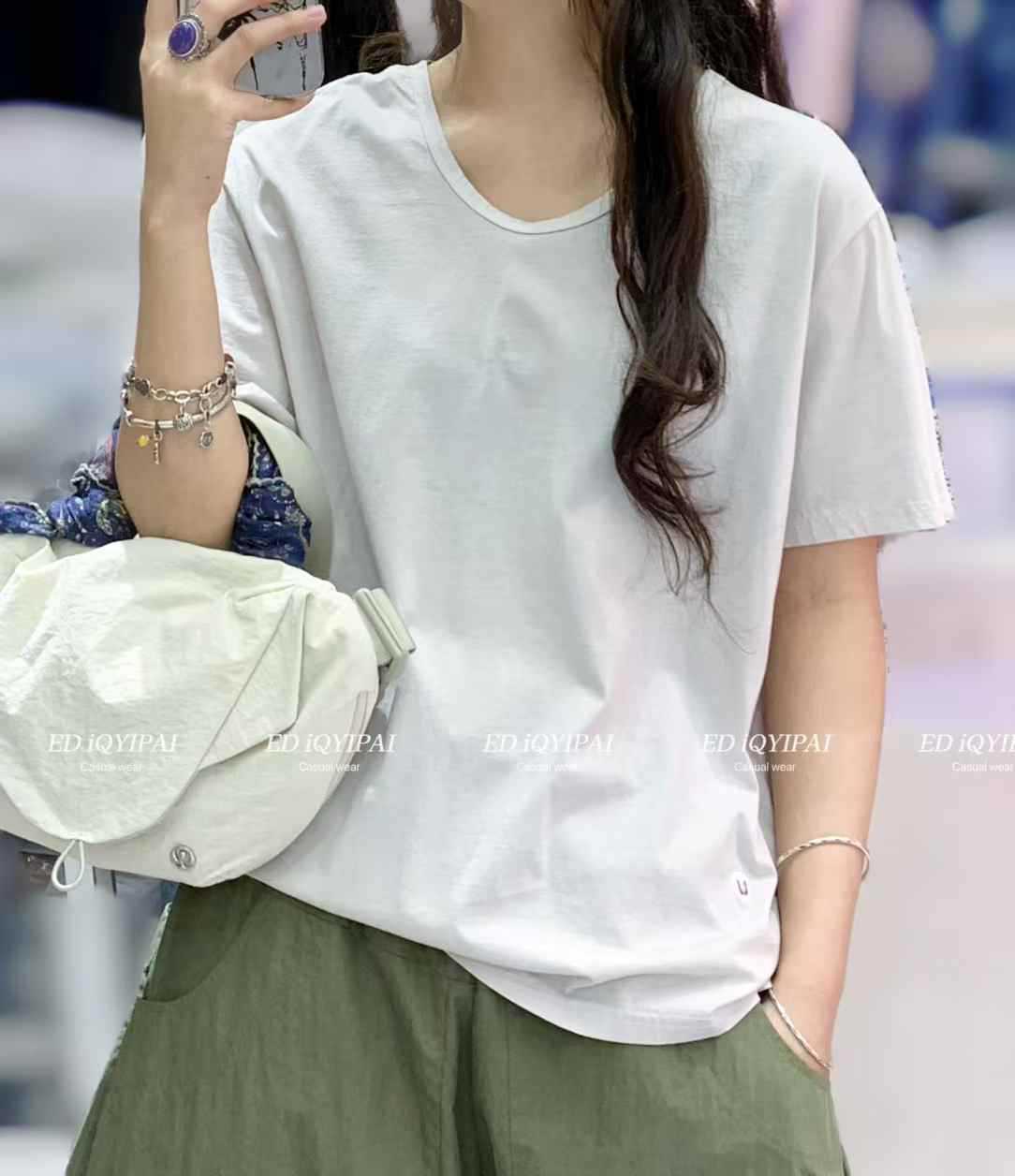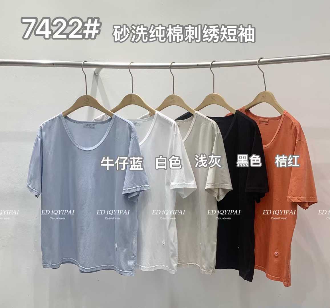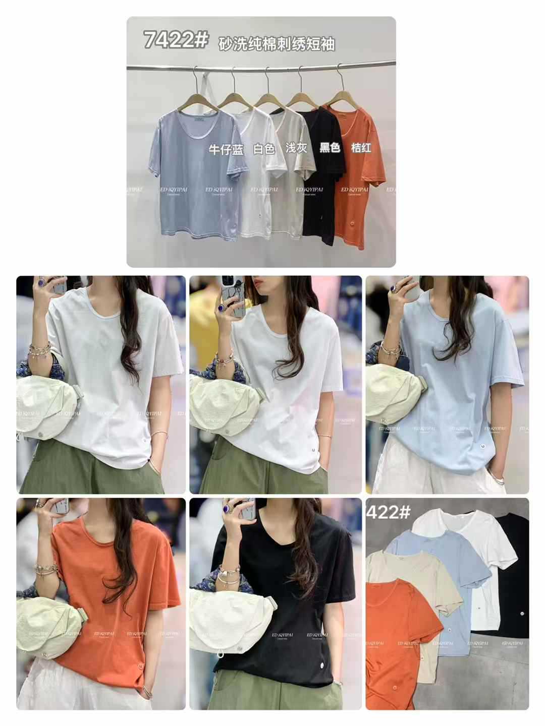 Ed7422砂洗純綿刺繍減齢痩せ半袖tシャツ2025百合気質カジュアルジャケット夏