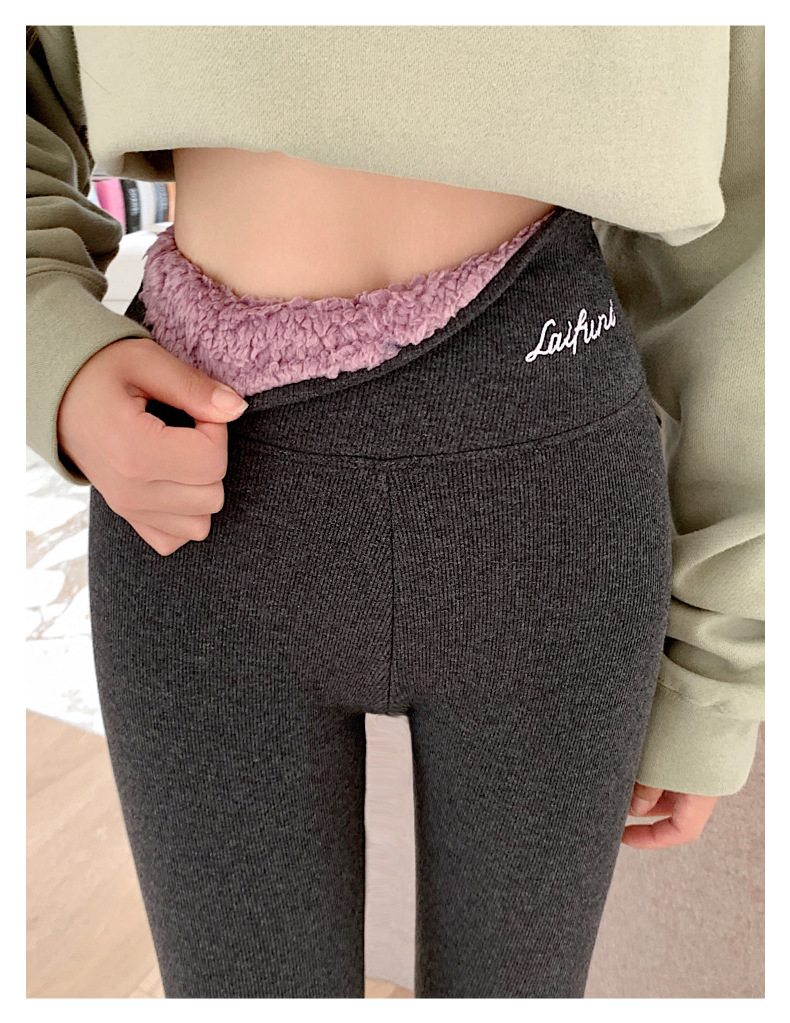 加厚羊羔绒打底裤女秋冬外穿腰部刺绣保暖裤子竖条纹高腰加绒棉裤