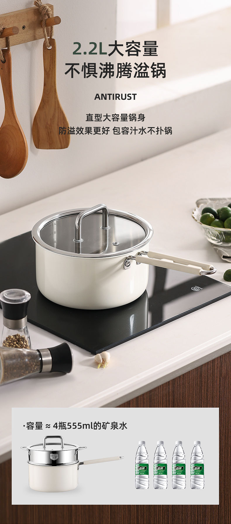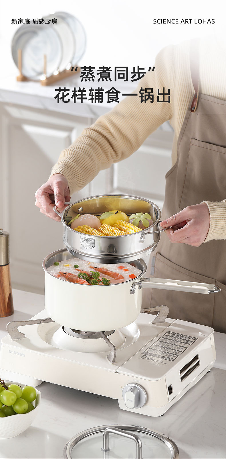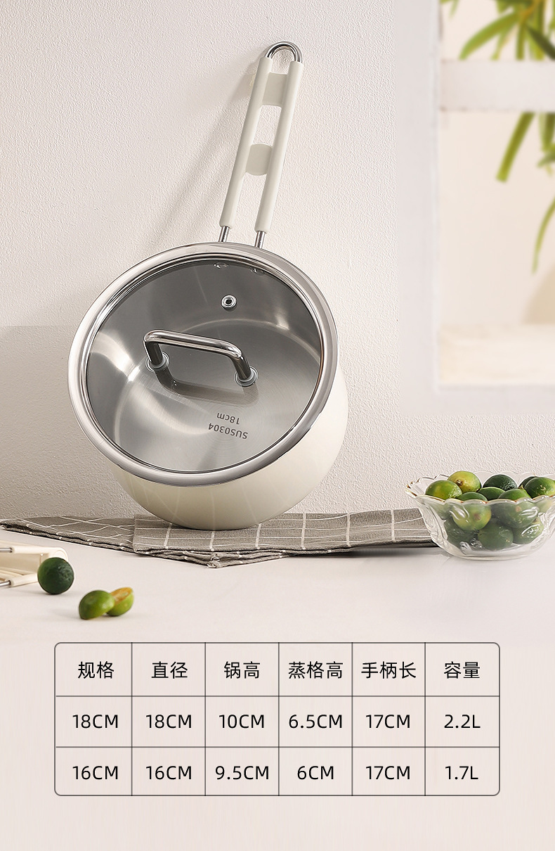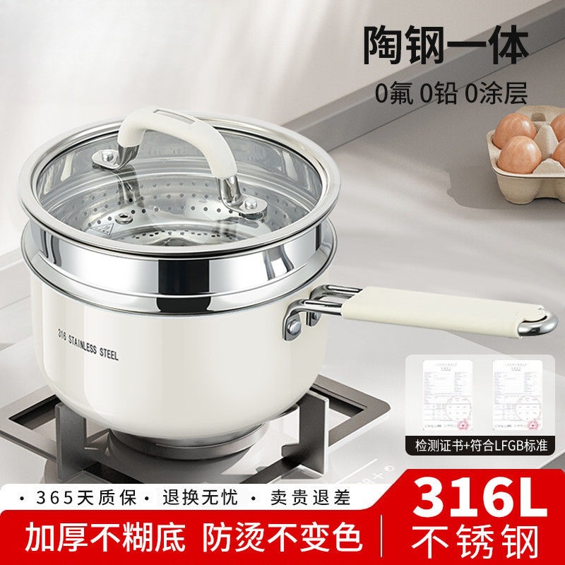 无涂层316L不锈钢陶瓷小奶锅宝宝婴儿辅食锅不粘锅蒸煮一体汤锅