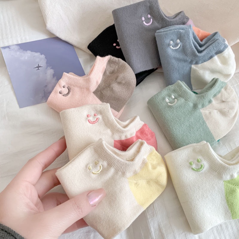 韓国風カラーブロックボートソックス女性用、かわいい笑顔の浅い口の靴下、ドーパミン落下防止、春夏インビジブルソックス、夏浅い口