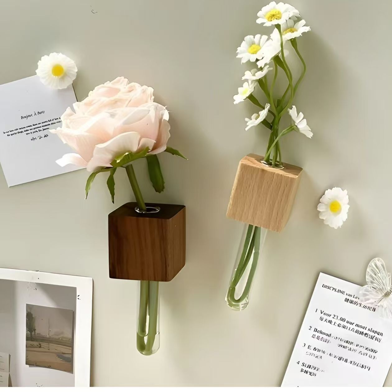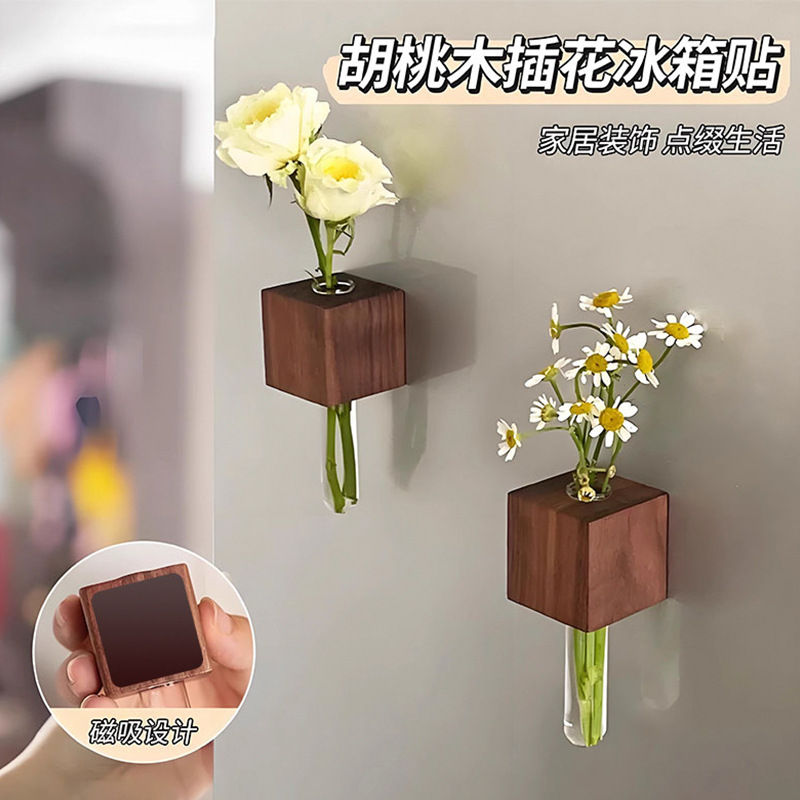 实木创意插花器冰箱贴磁铁磁吸装饰立体种花养花玻璃试管花瓶个性