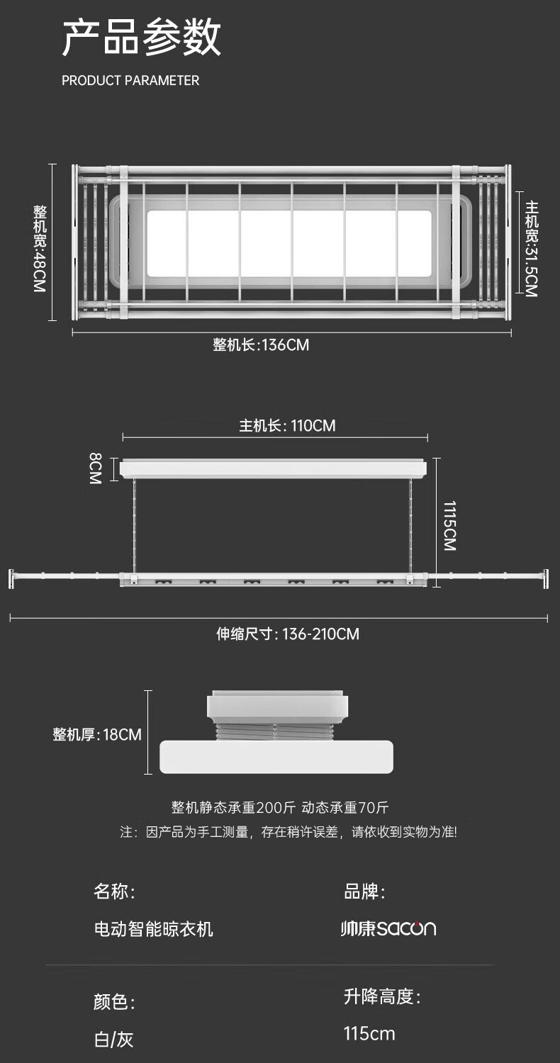 電動ハンガー全画面照明超薄型シンプルスマートリモコン昇降家庭用ベランダ伸縮日焼け棒ホワイト