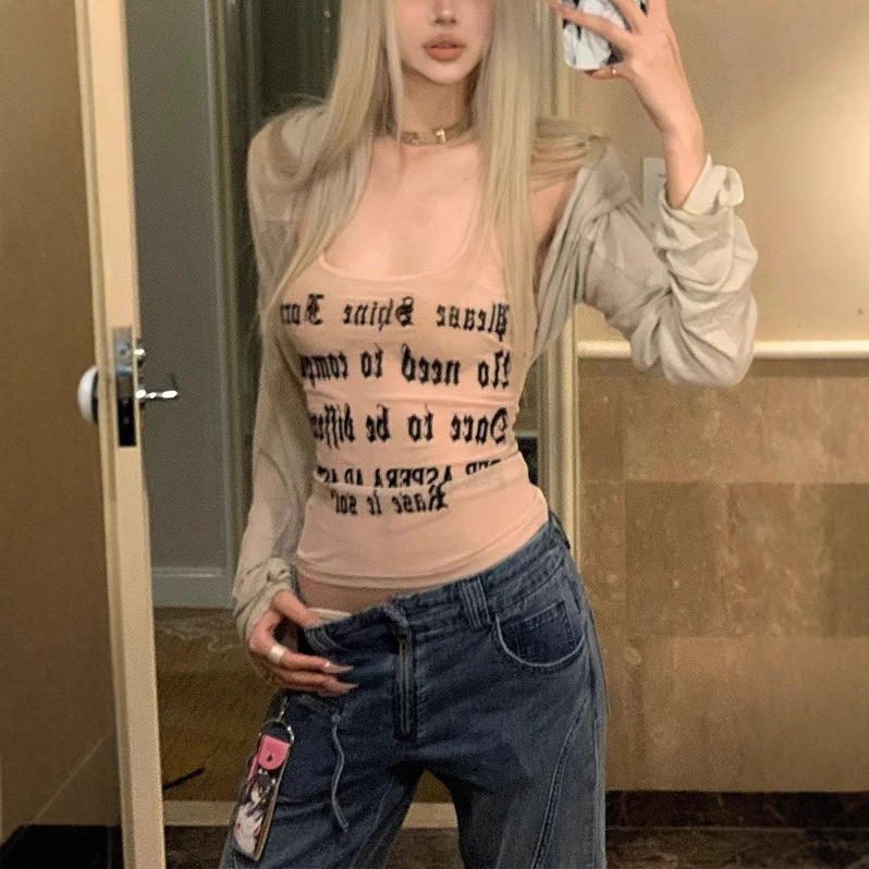 Rase le sol'Passion code '植毛アルファベットメッシュノースリーブチョッキギャルキャミソール