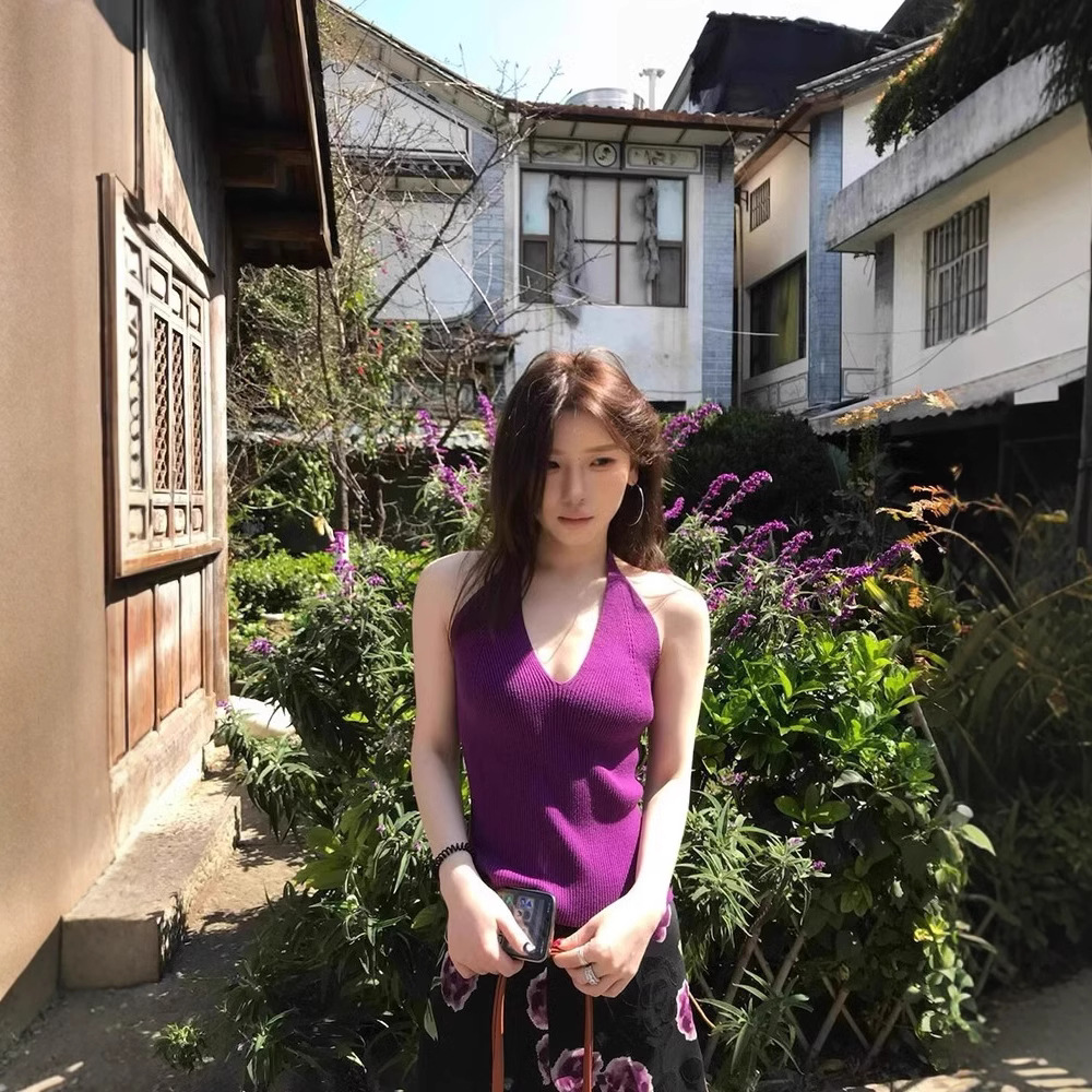 2025紫の首のベストの女性の春の新型の海辺のギャルのファッションの袖なしの短い項のストラップの上着のファッション