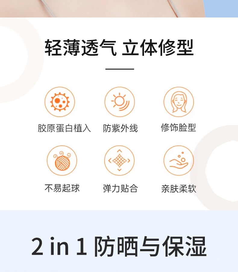 コラーゲン日焼け止めマスクの女性は紫外線を防ぎ、薄くて通気性があります。