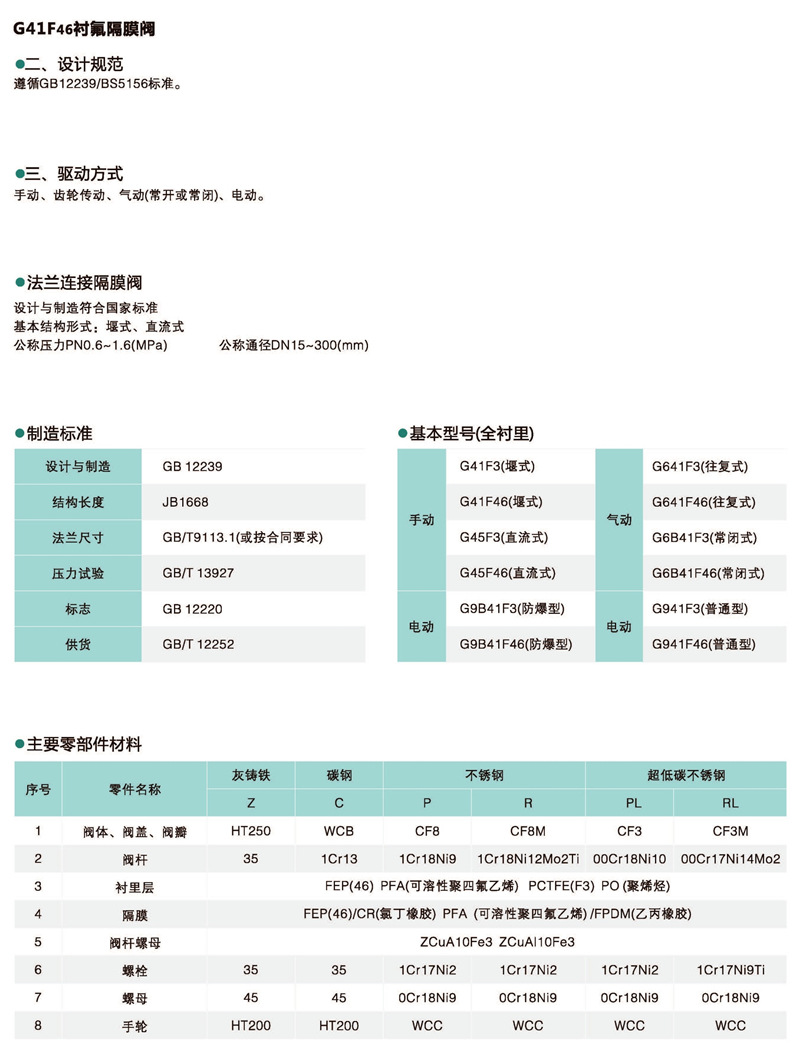 仕様 G41F46-16P DN25,G41F46-16P DN32,G41F46-16P DN40,G41F46-16P DN50,G41F46-16P DN65,G41F46-16P DN80,G41F46-16P DN100,G41F46-16P DN125,G41F46-16P DN150,G41F46-16P DN200,G41F46-16P DN250,購入: 316L、鋳鋼、PFA、F4 ライニング