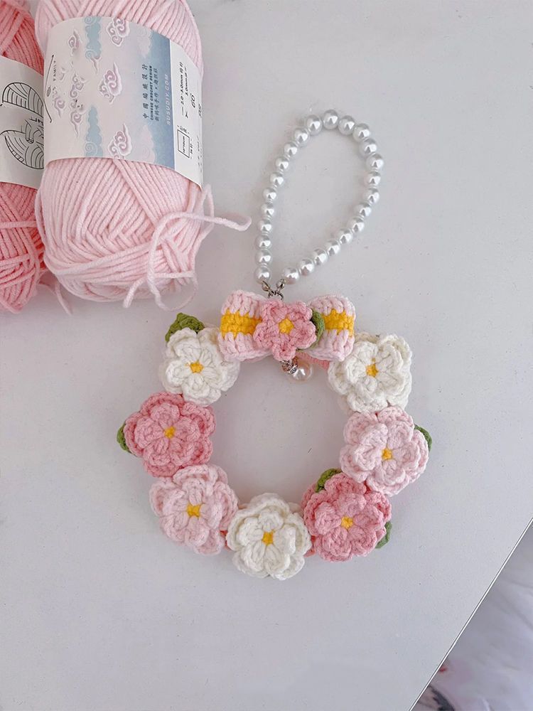 春の親友山茶花編み花輪ストラップ手作り毛糸包みかぎ針材料diyキーホルダー