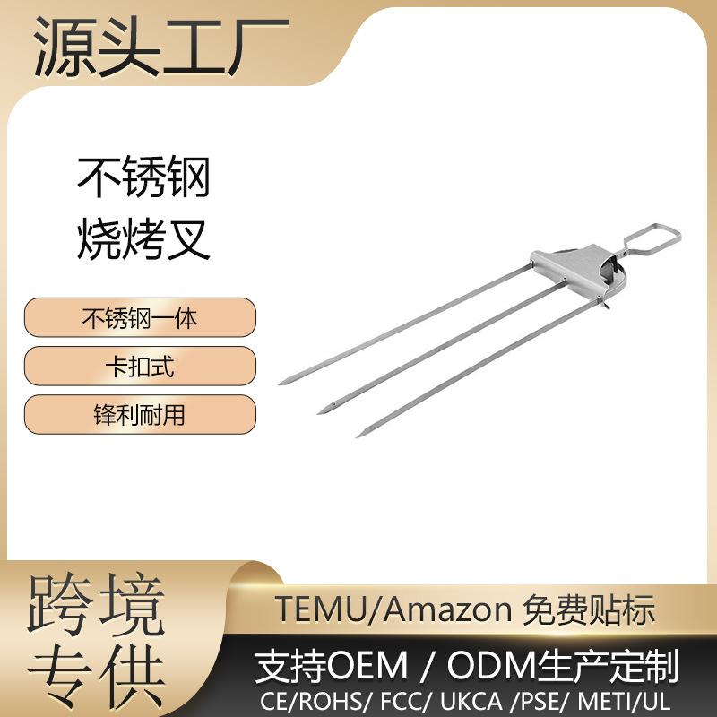 国境を越えた新作ステンレス製バーベキューフォーク、屋外用三股バーベキューフォーク、キャンプ用バーベキュー、プッシュロッド付きバーベキュー道具