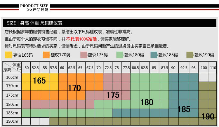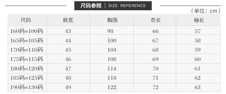 尺码 165/84A(105)码,170/88A(110)码,175/92A(115)码,180/96A(120)码,185/100A(125)码,190/104A(130)码,195/108A(135)码