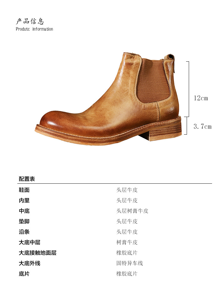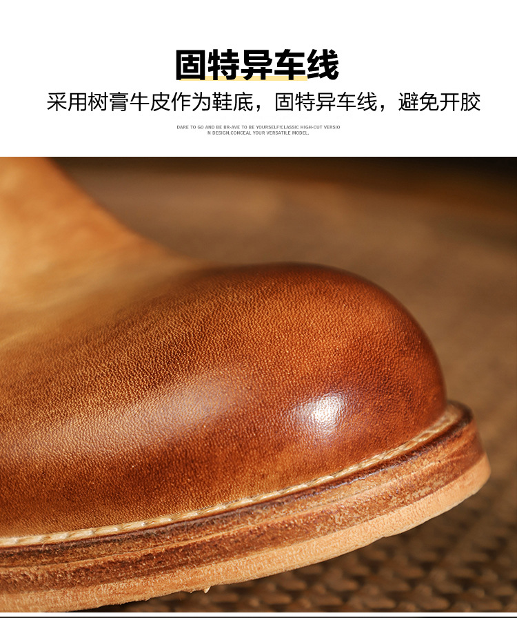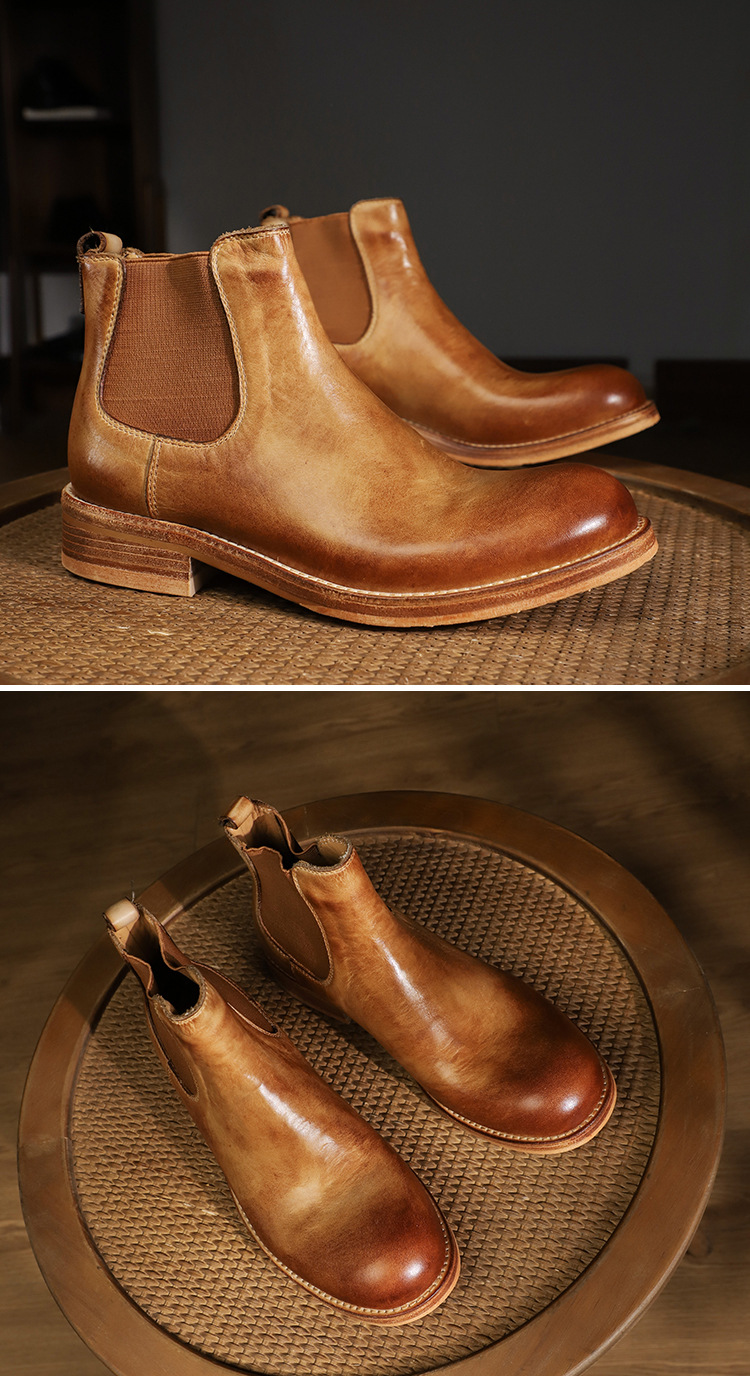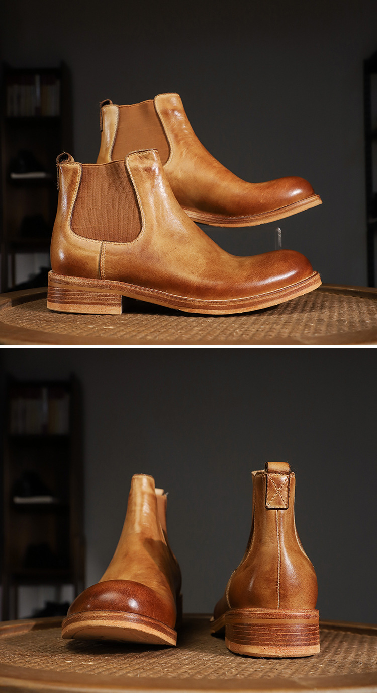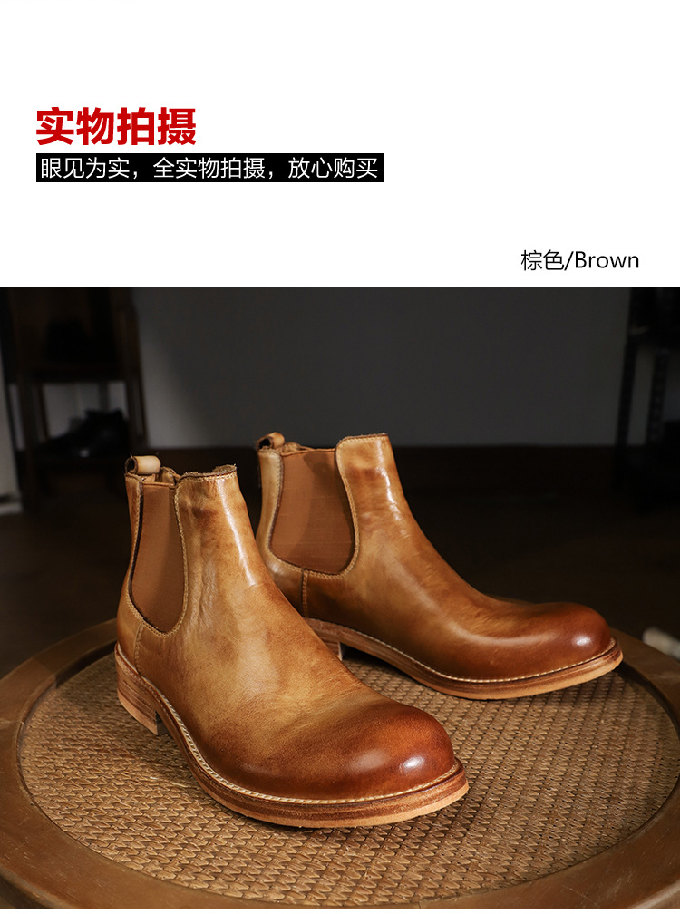 手作り手作り靴ウォッシュド植物タンニンなめし牛革メンズチェルシーブーツ英国スタイルスリッポンビジネスハイトップブーツラウンドトゥ