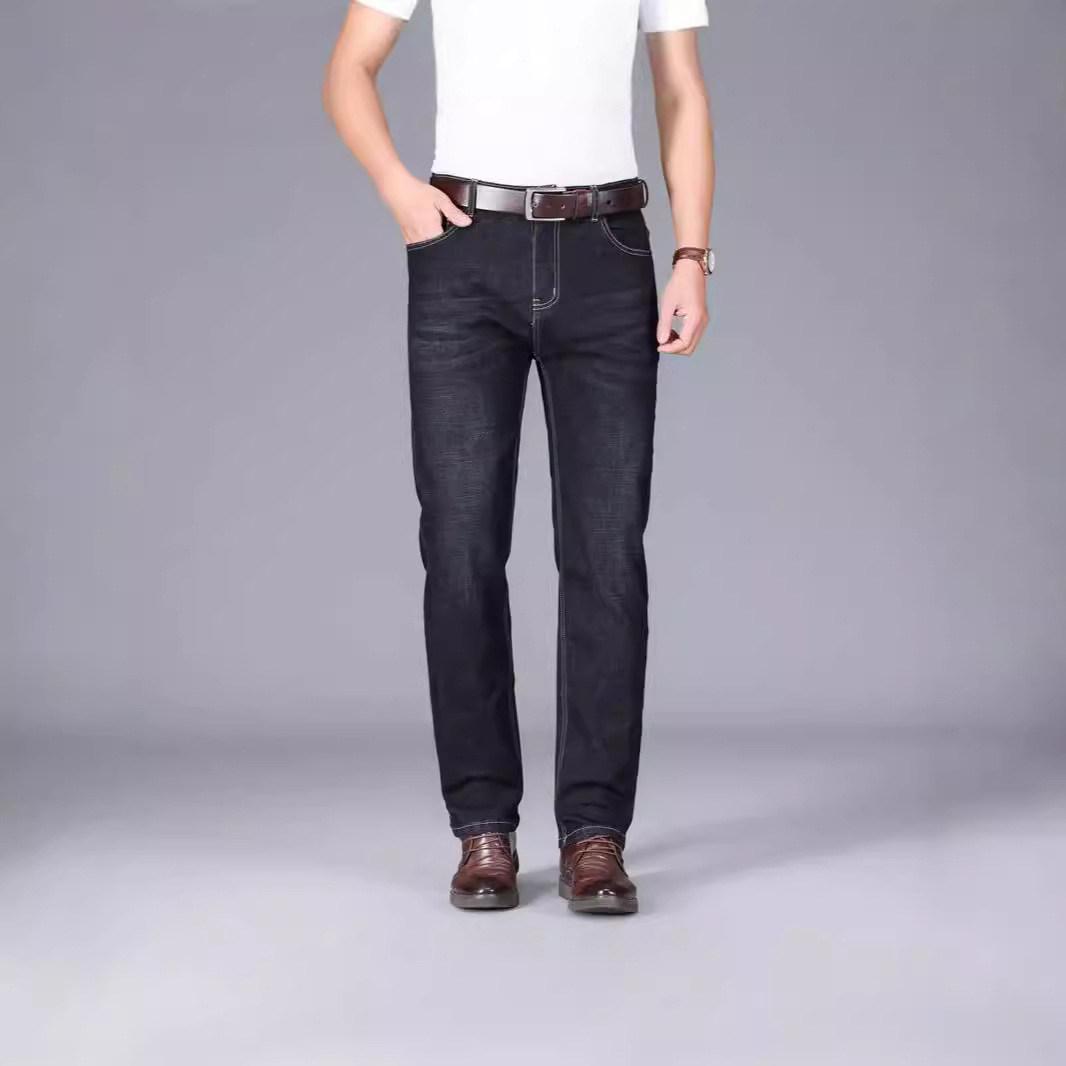 ジーパンの男性の新型のまっすぐな筒の中で老年の弾力のゆったりしている大きいサイズの薄い金のベルベットのデニムのズボンの卸売りは代行します。