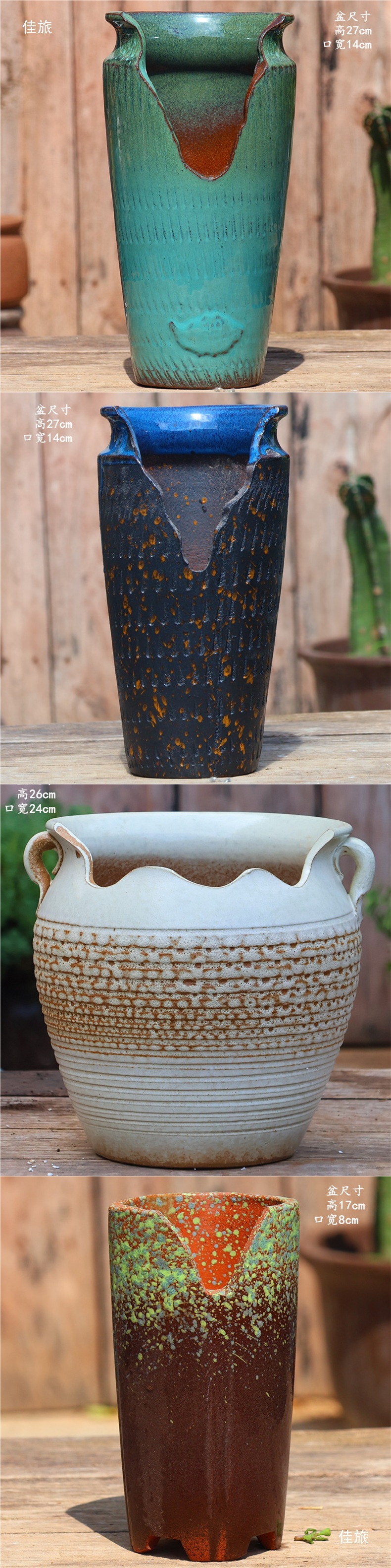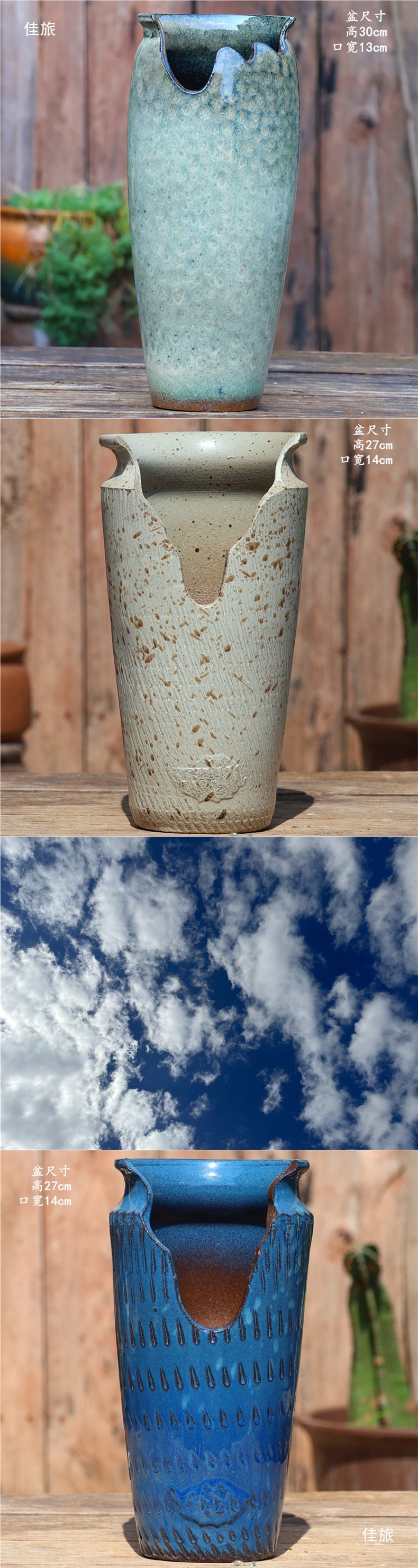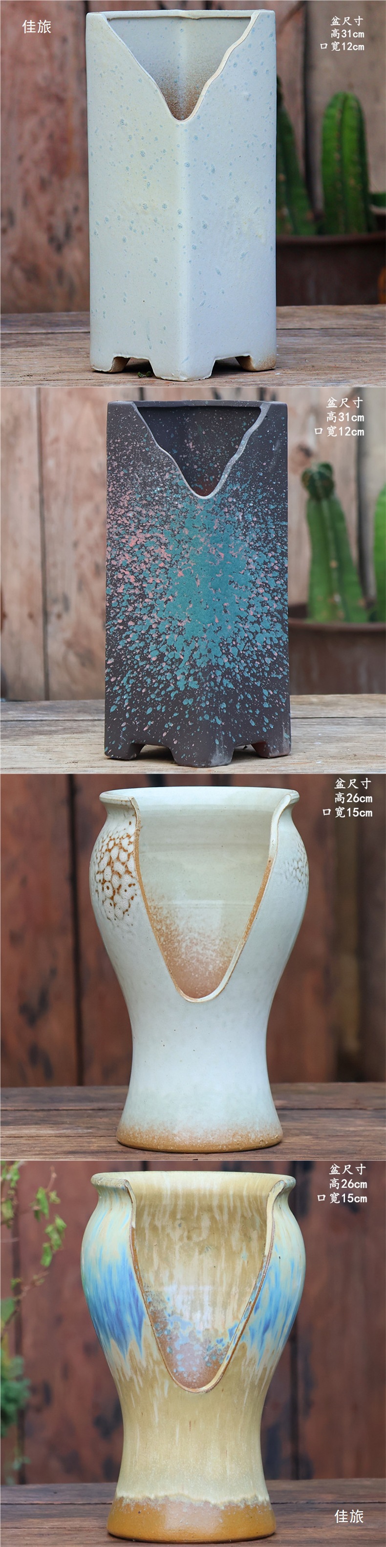 手作りの粗い陶器の四角いノッチ付きの高い植木鉢、多肉植物の鉢、ストレートカットの通気性のある陶器の鉢、崖の古い杭の緑の植物の大きな口の鉢