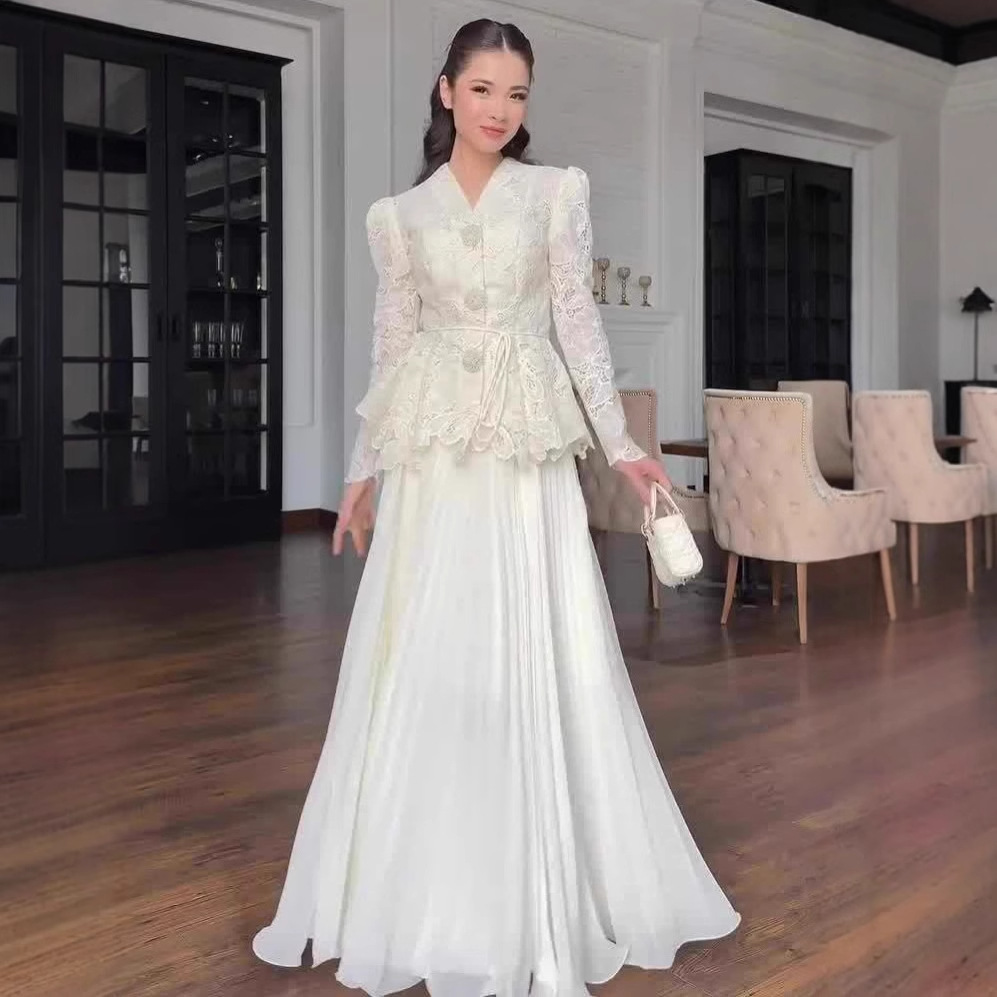 2025年新作 フェスティバル・宴会用ドレス ライトグレーの微光沢ヘッドスカーフ ダイヤモンドチェーン装飾 東南アジア風 ウエストシェイプ スイートロングドレス