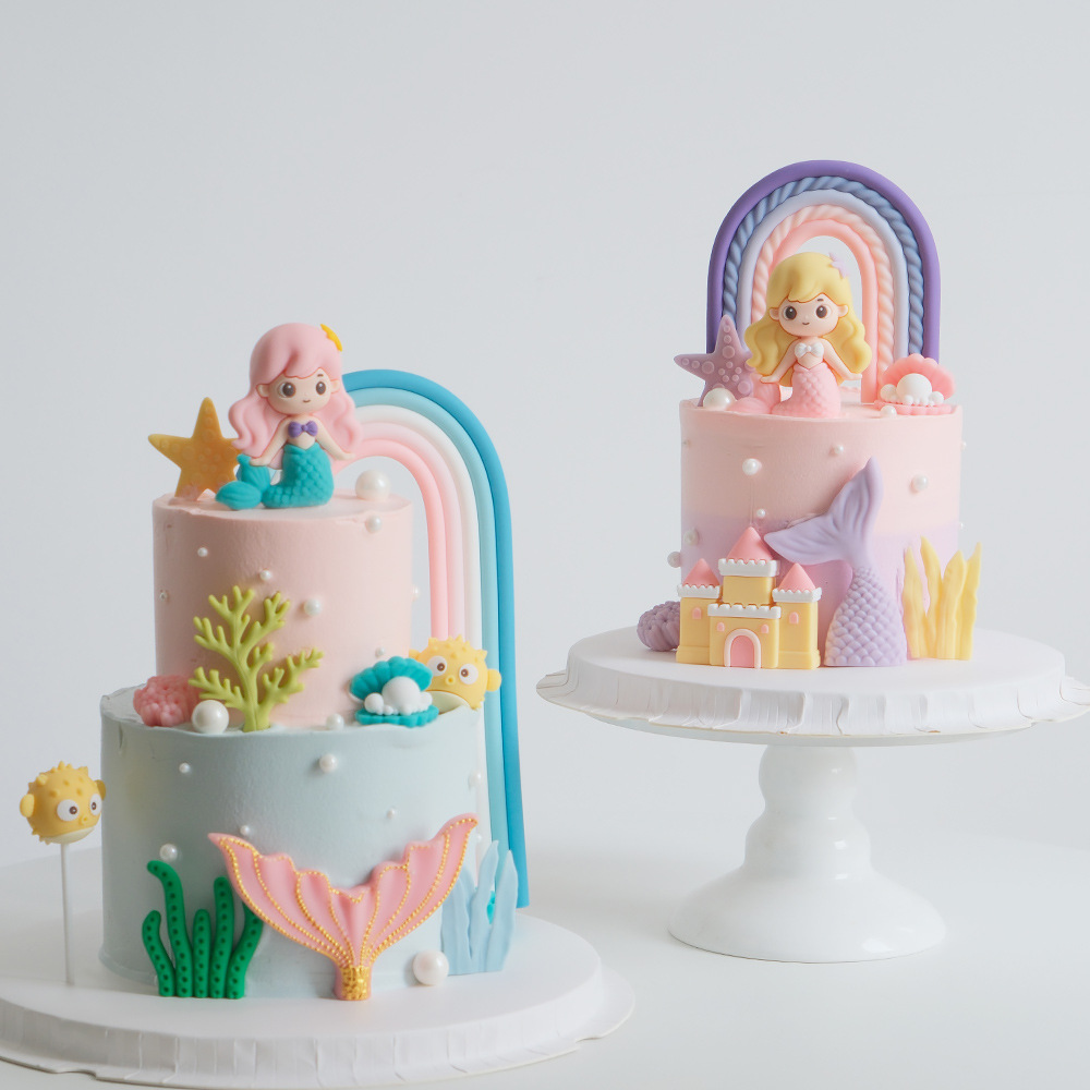 美人鱼蛋糕装饰彩虹鱼尾贝壳城堡桌面摆件公主摆件海星汽车摆件
