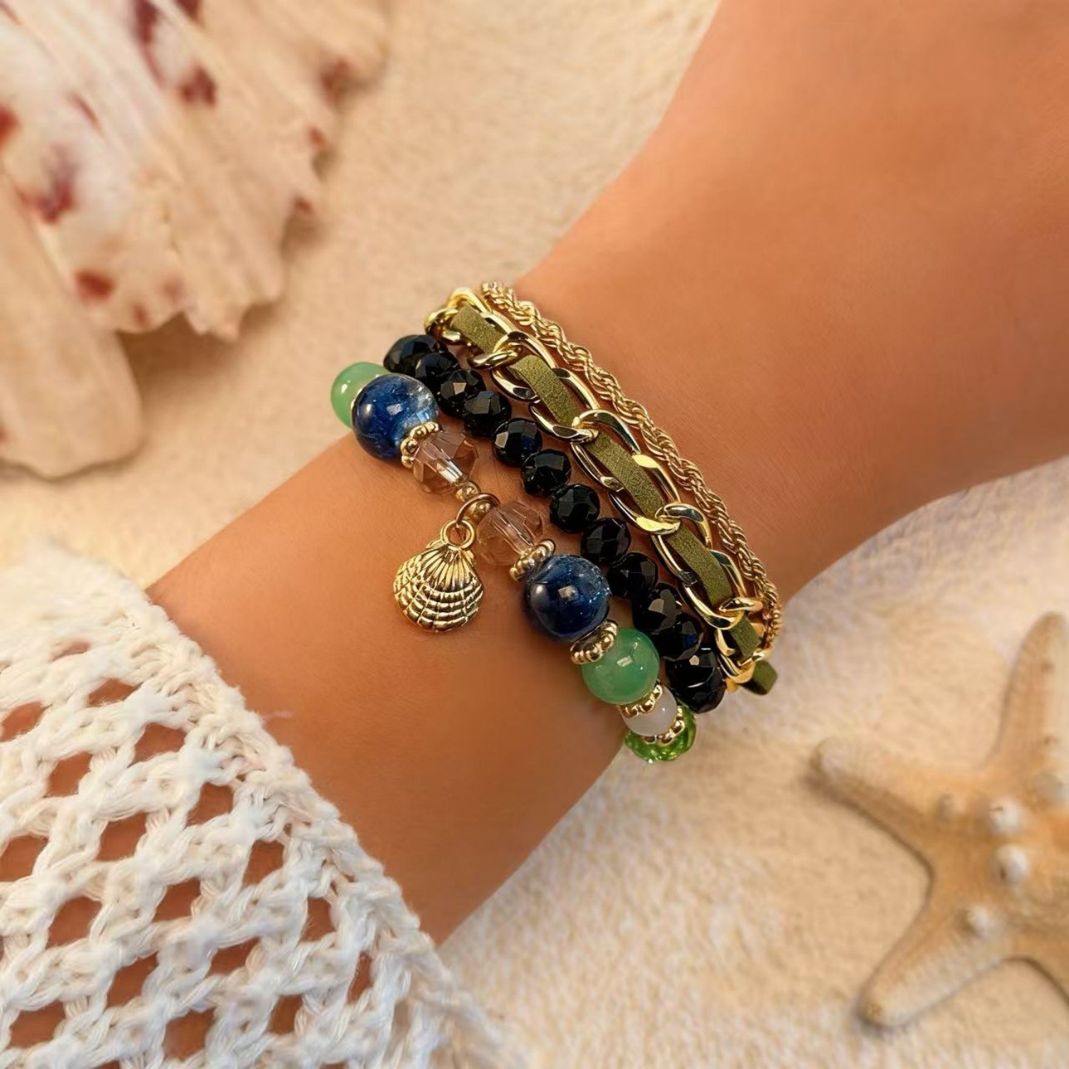 欧美跨境波西米亚多层串珠手链创意仿玛瑙链条彩色玻璃手串四条装