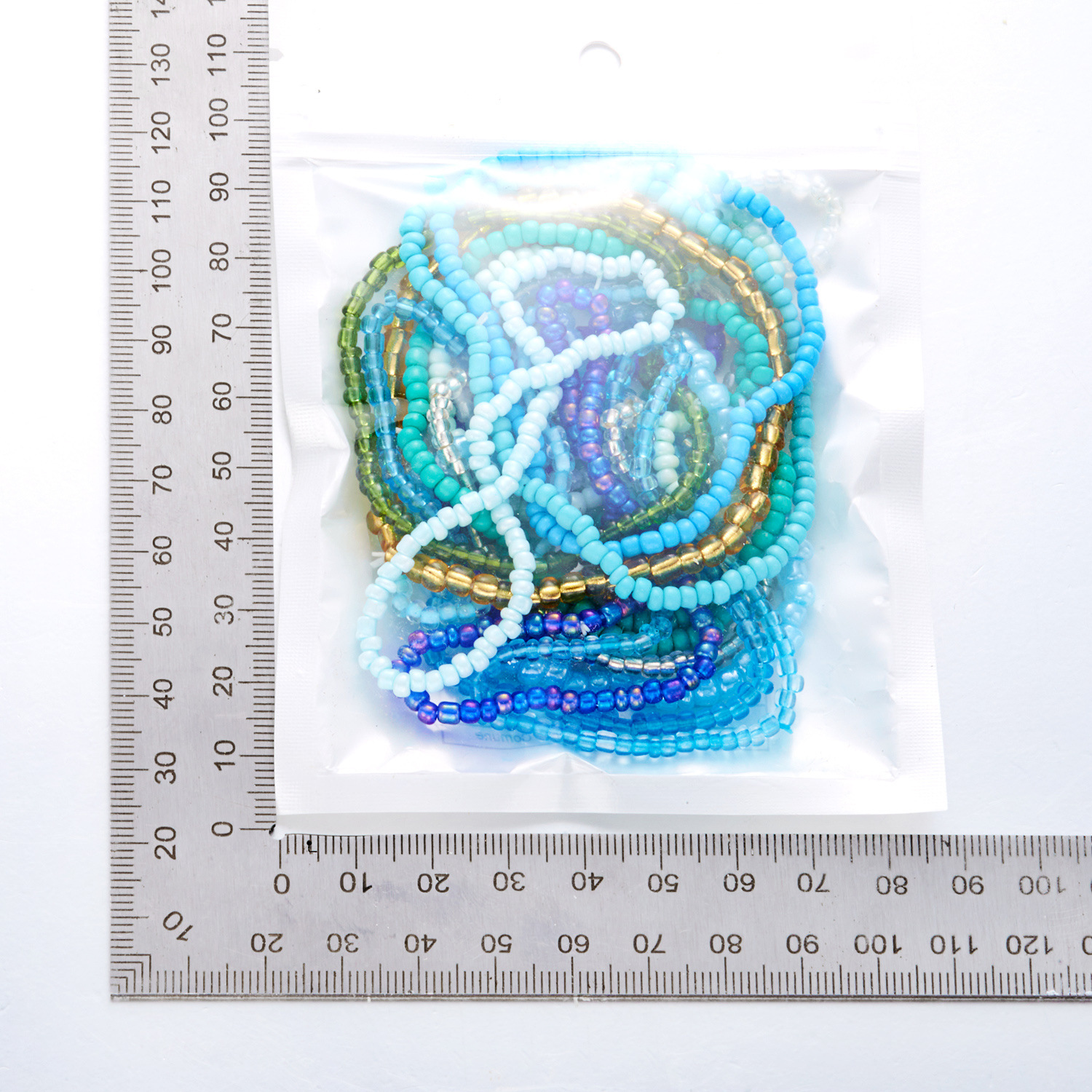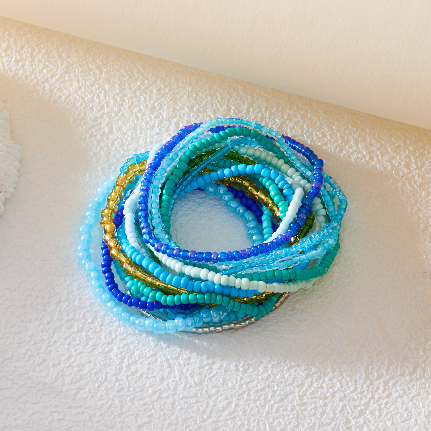 メーカーのカラーグラデーションビーズのブレスレットを重ねてファッションを身につけます。