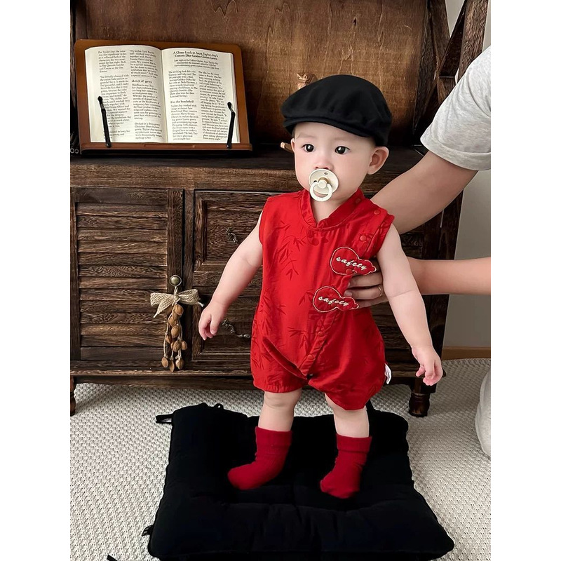 婴儿衣服夏季薄款唐装中国风无袖连体衣小月龄男宝宝百天抓周礼服