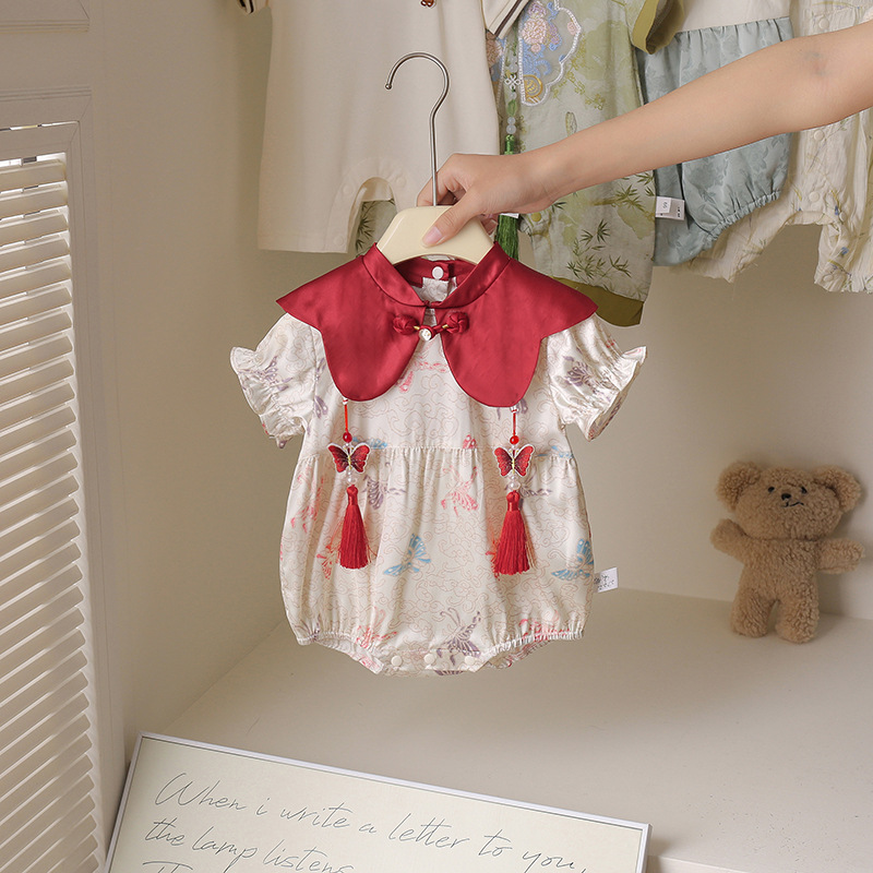 赤ちゃんの国風の夏のタイプのお尻の服の女性の赤ちゃんの夏の薄いタイプの半袖のワンピースの満月の満1歳の中国式は服を登ります