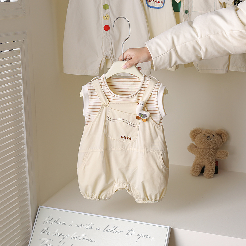 赤ちゃんの夏の服2025の新型の赤ちゃんのスーツのストライプの半袖のバックのズボンの韓国版の2つのセットの外で服を着ます。