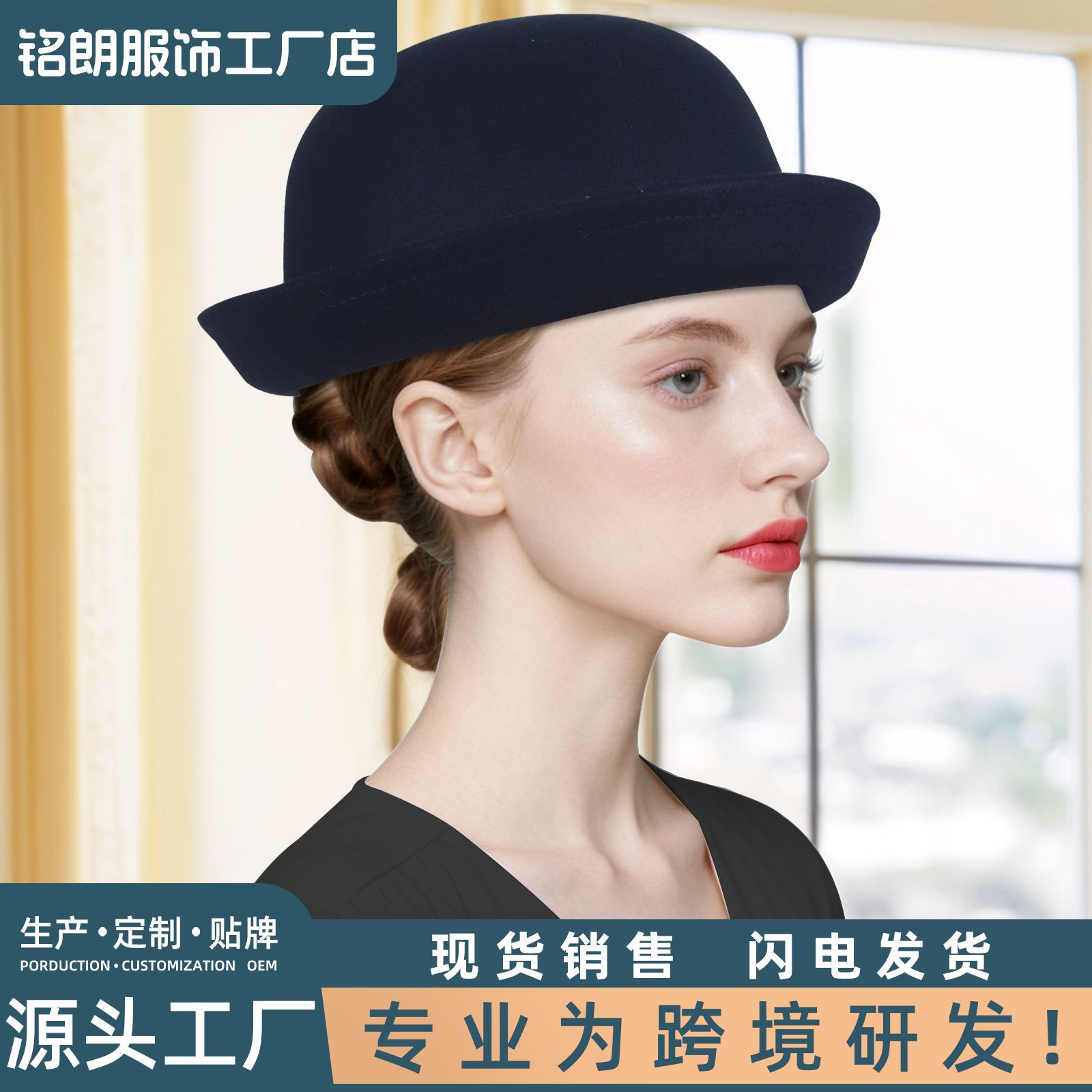 新款跨境纯色时尚秋冬季圆顶仿羊毛呢毡帽法式复古英伦风礼帽女士