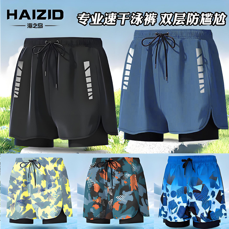 水泳パンツメンズ 2025 新しい二重層速乾性水泳パンツ抗恥ずかしい水着ビーチパンツ水泳セット機器卸売