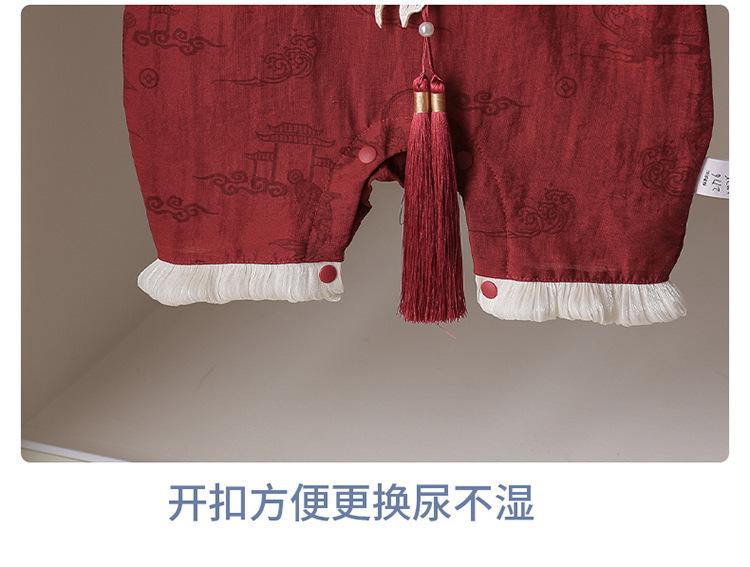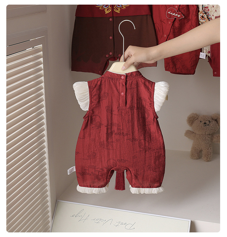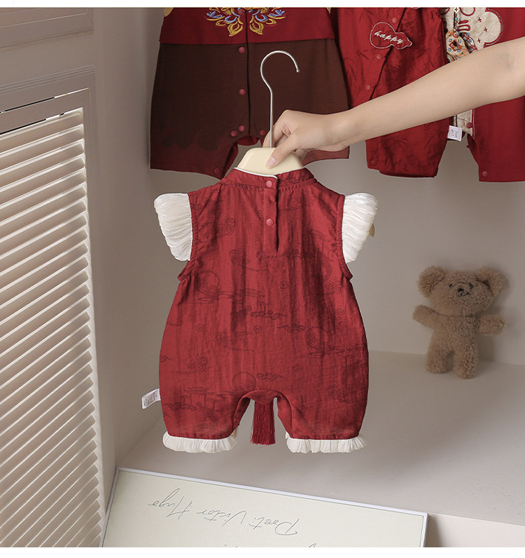 2025夏の新型赤ちゃんのお尻の服の国風の女性の赤ちゃんは薄いタイプの赤ちゃんの服の満月の百日間のドレスに登ります。