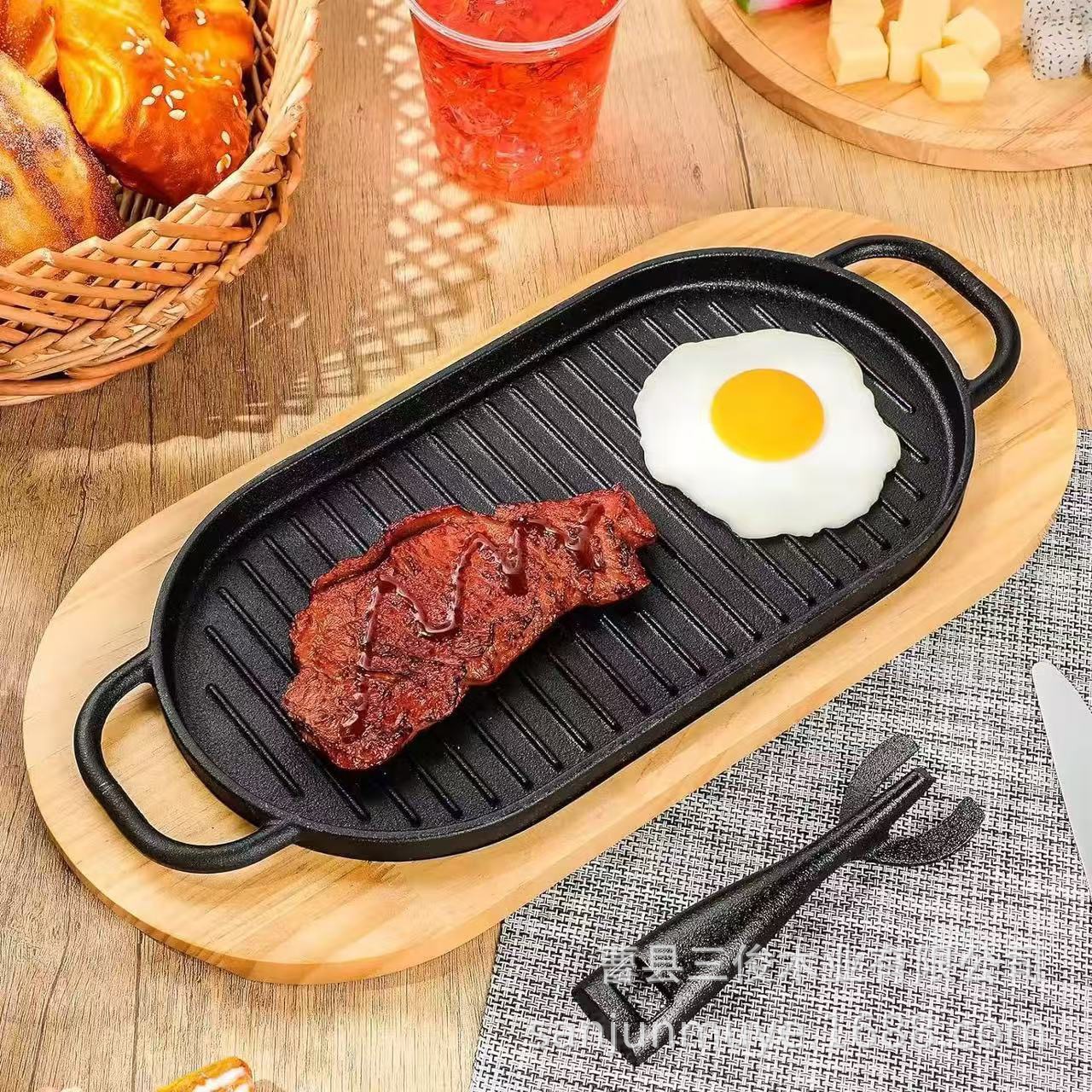 木製オーバルステーキプレートバーベキューストール厚みのある鉄板木製ベースキッチン木製火傷防止断熱トレイ