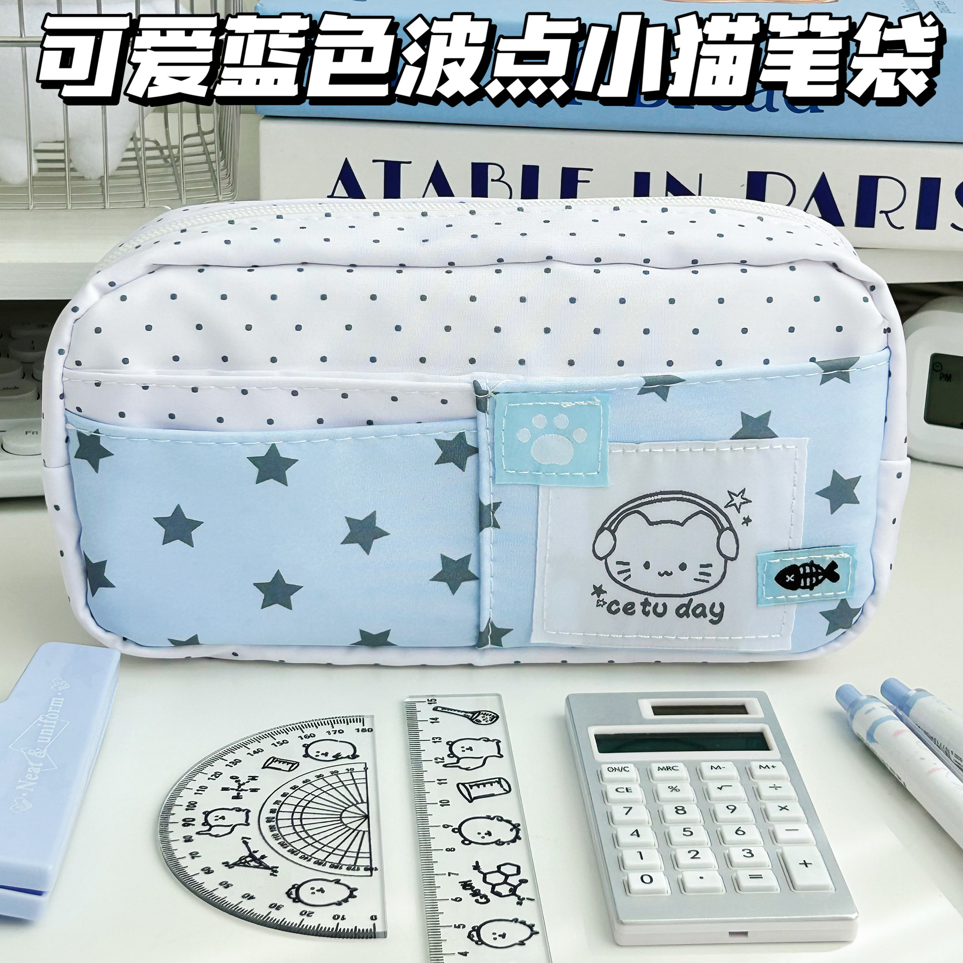 波点魔法小猫笔袋可爱日系小猫多层文具包高颜值学生大容量铅笔袋