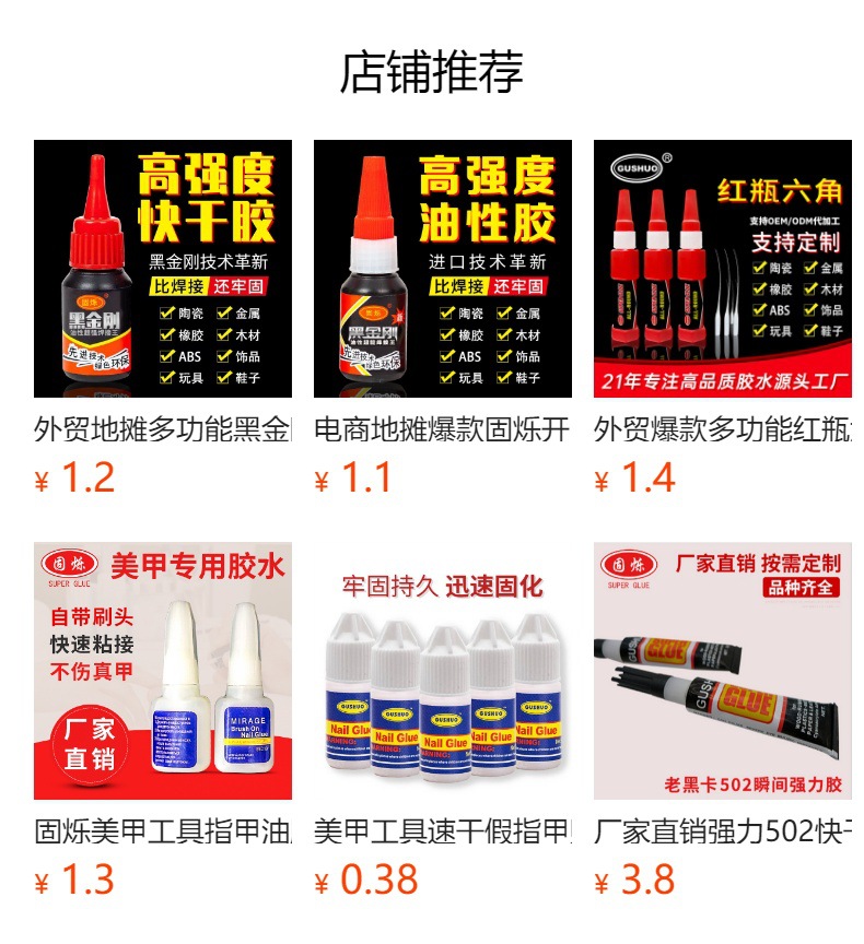 鄂州市固乐粘合剂厂主营各类万能胶、防水胶、401、老鼠胶、甲片胶、睫毛胶、饰品专用胶等;支持定制贴牌、产品远销国内外:为电商、地摊、跨境电商、外贸客户等提供质量好,价格优的产品。