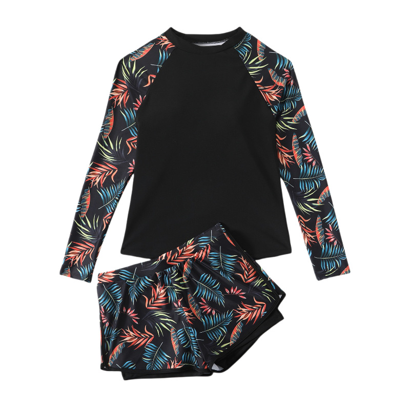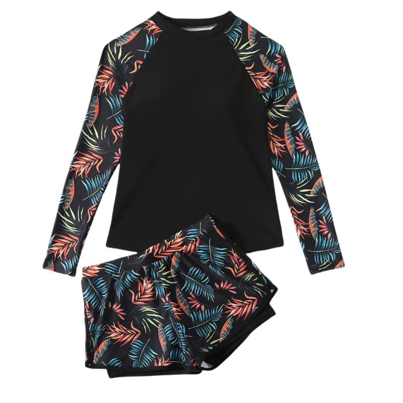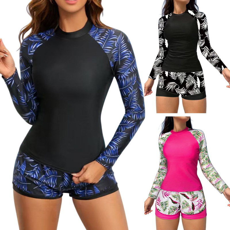 2025クロスボーダーの新型欧米の外国貿易の水着の長袖のプリントは2層の半ズボンの女性をつなぎ合わせます。