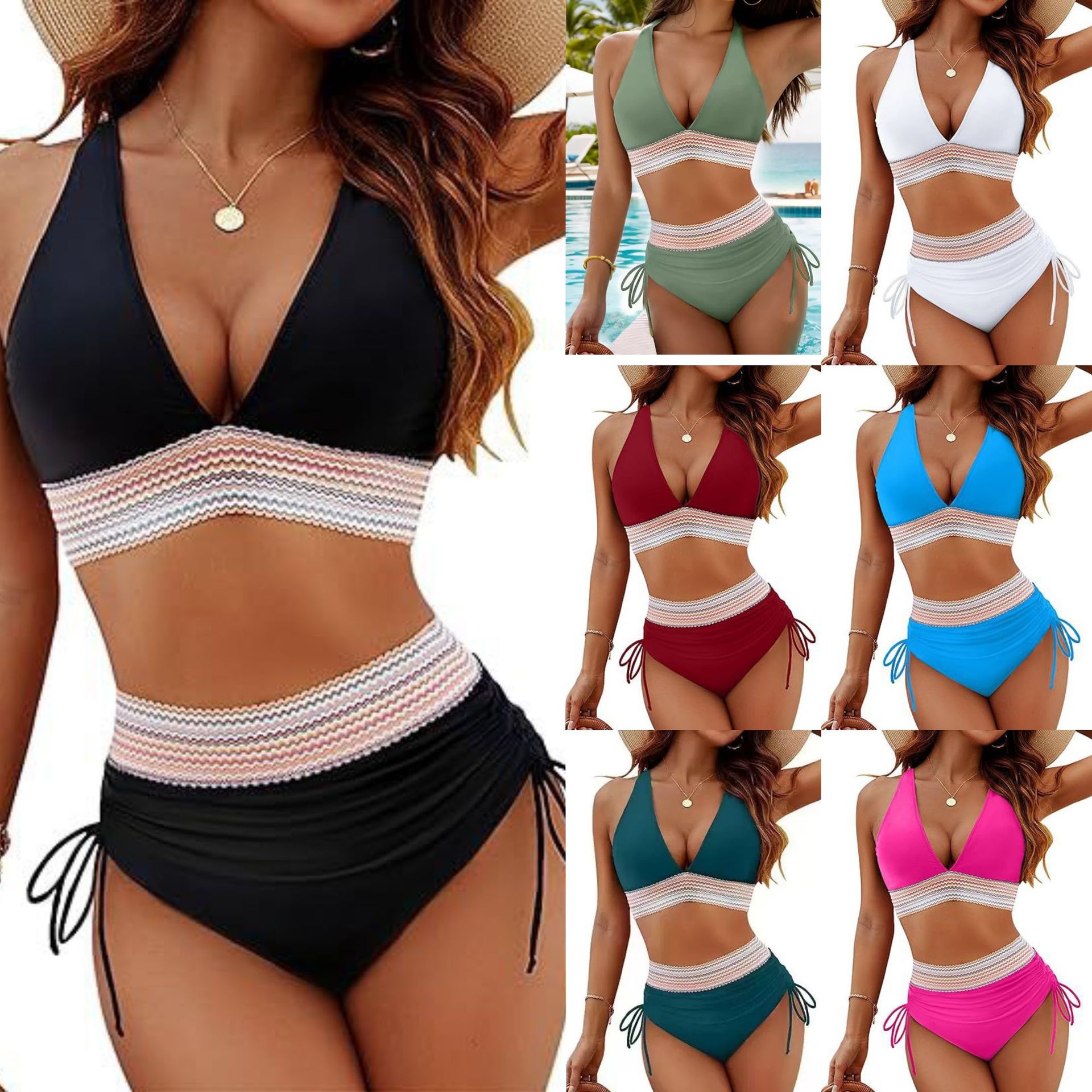 2026欧美拼接单肩带胸垫沙滩比基尼亚马逊高腰三角裤分体泳衣跨境